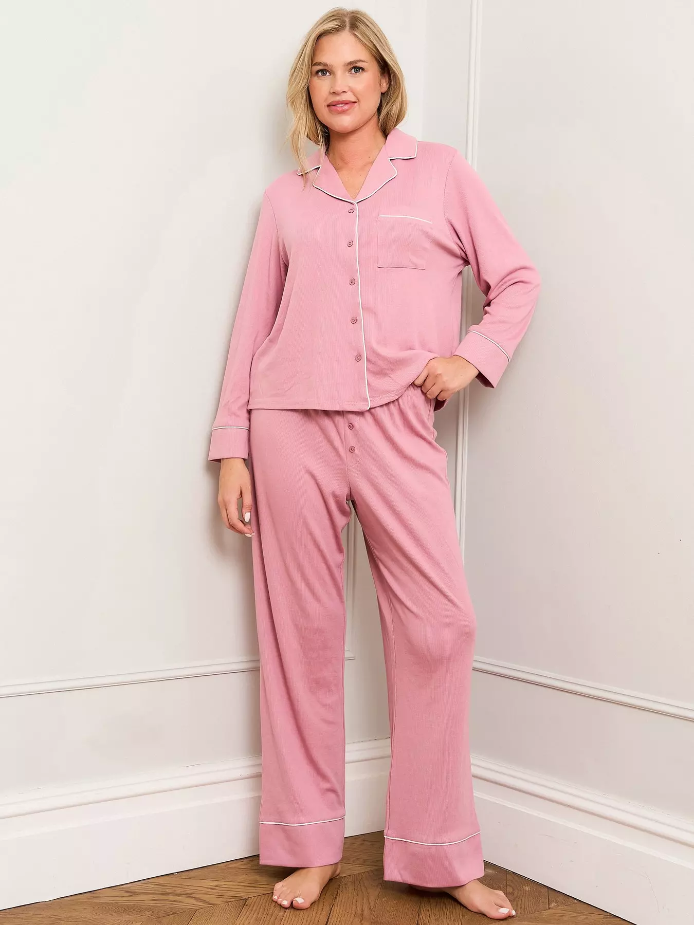 Fashion fades but you always need your pj's! This beautiful classic super soft ribbed pyjama is the perfect piece to complete your nightwear collection this winter.The softest trousers complete with a branded tab at the waist, a matching long sleeve top, with tone on tone piping. The finer details of the chunky waist band & the deep cuffs on the trouser & the top make this piece feel super luxurious.