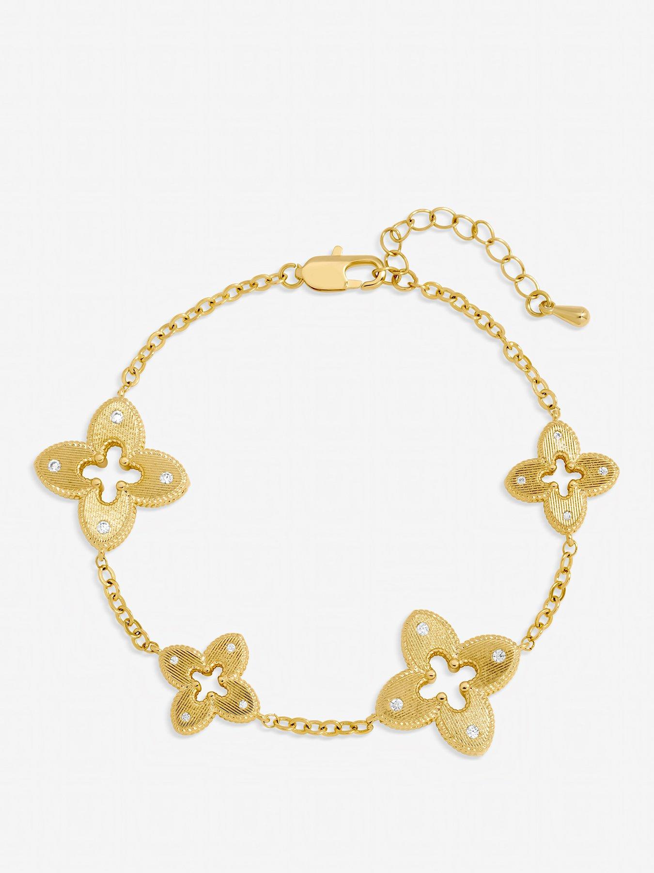 Jon Richard Jon Richard Gold Plated Textured Crystal Clover BraceletThe Jon Richard Gold Plated Textured Crystal Clover Bracelet is a sophisticated and sparkling addition to any jewellery collection. Featuring lustrous crystals set in textured gold clover motifs, it catches the light beautifully with every movement. Perfect for both day and evening wear, this bracelet adds refined elegance and timeless charm to the wrist. Fastening: Lobster clasp. Width dimension: 20mm, length dimension: 25mm. Material: Gold plated base metal.