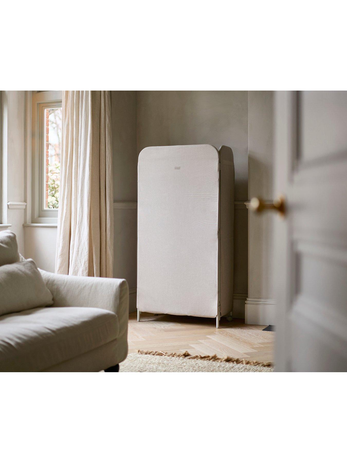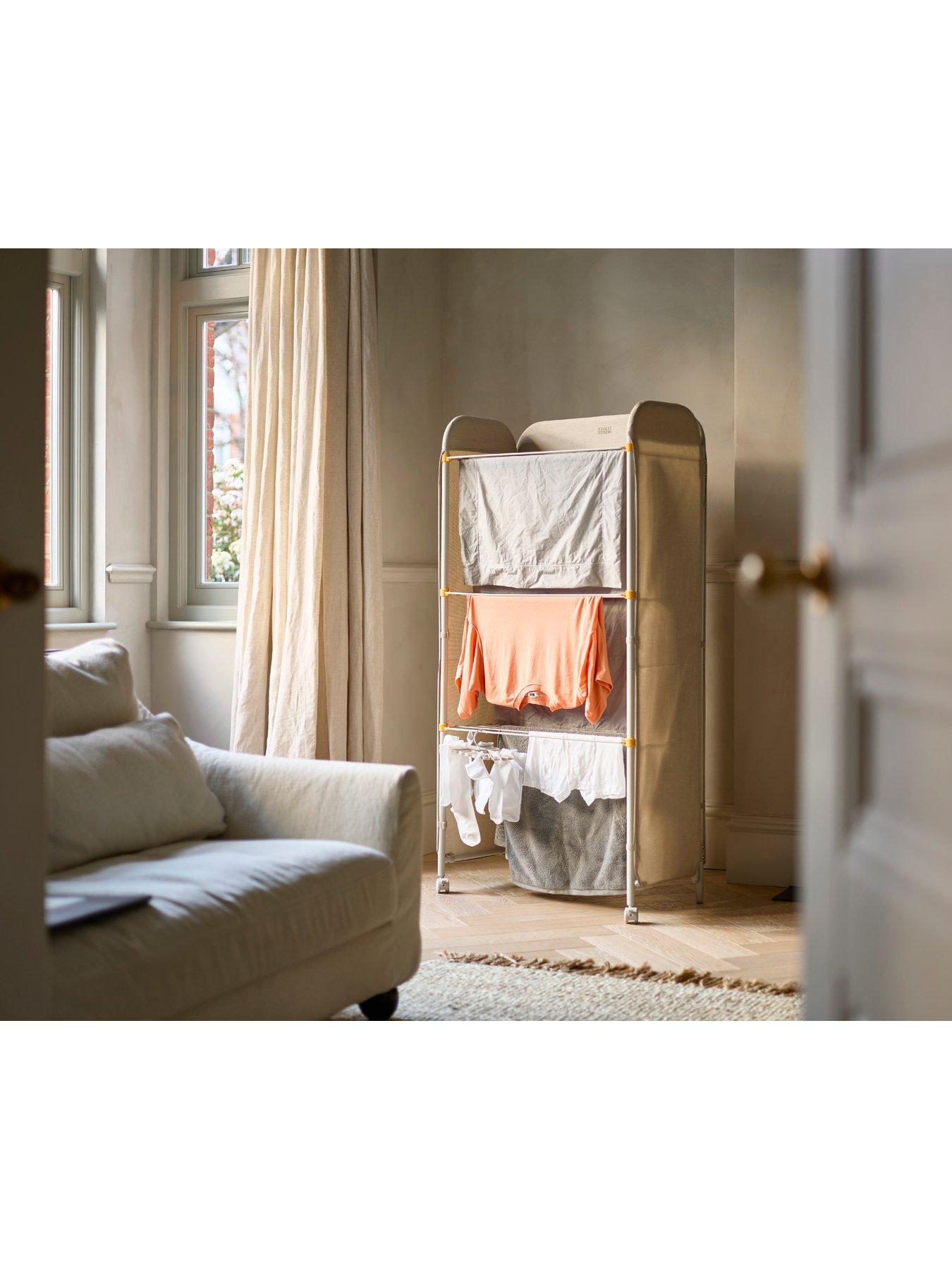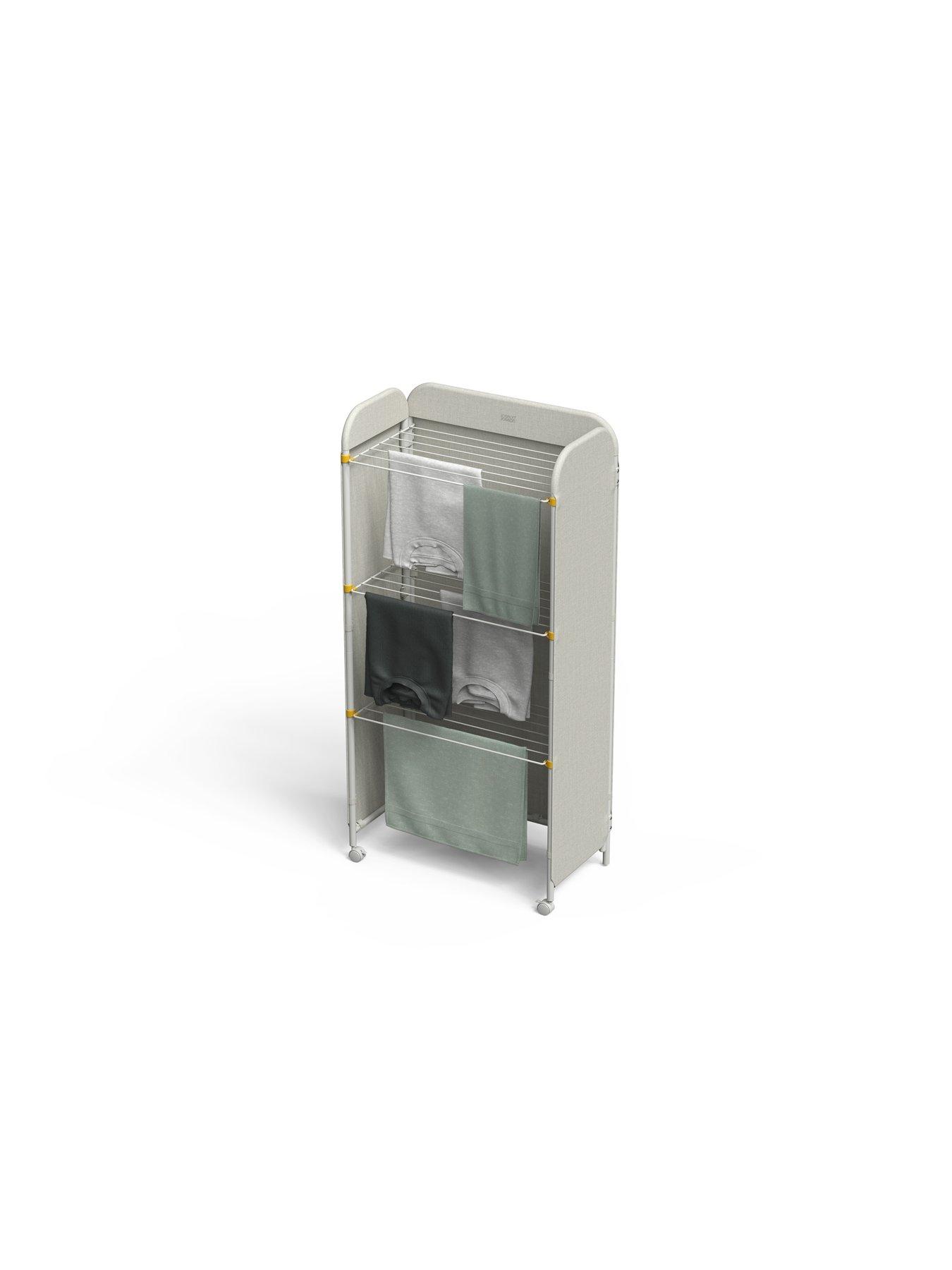 Joseph Joseph 3 Tier Clothes AirerConceal your drying laundry from sight with this smart 3-tier indoor clothes airer. The innovative screen design features a stylish fabric cover that neatly hides unsightly laundry and complements a wide range of room styles. The three heavy-gauge steel wire tiers offer spacious drying room, and can be individually folded down for when you need to dry longer items like dresses and shirts for example. Really easy to set up, this slimline drying rack includes lockable wheels allowing you to move it easily around your home and when the drying is complete, you can simply fold it flat for space-saving storage.