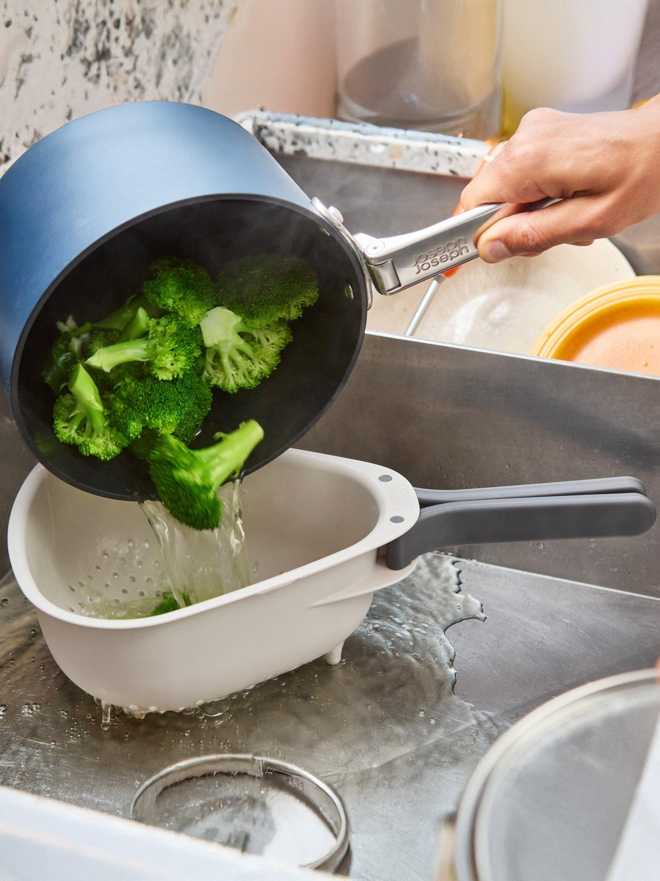 Joseph Joseph Droplet Large White Colander With Folding HandleDroplet is a clever colander that features innovative handles that fold to save space in your kitchen cupboard. Its generous size is perfect for draining or rinsing bulkier items of food like vegetables or pasta. After use, simply fold the handles in for space-saving storage.