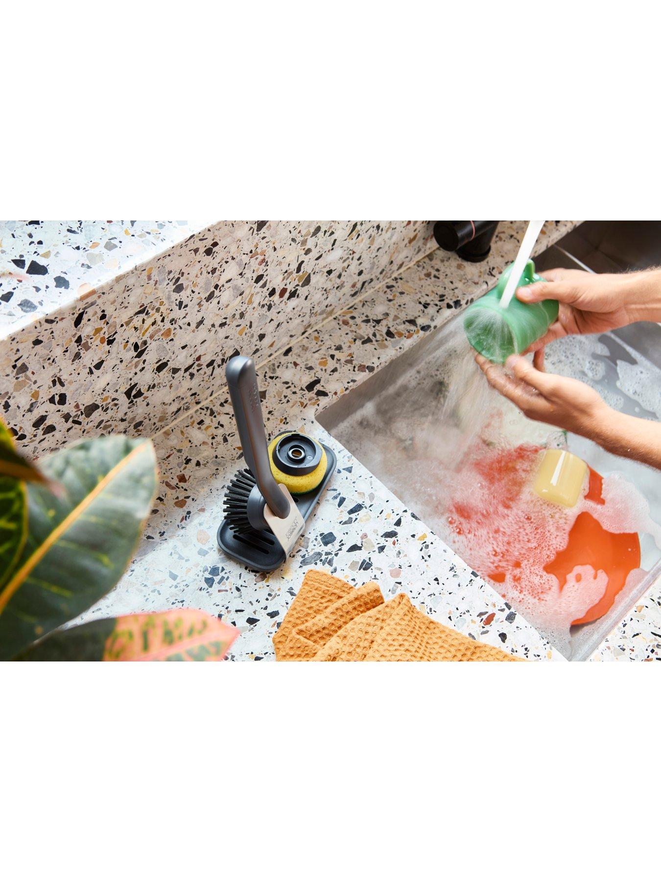 Joseph Joseph Sinktech Brush With Large Storage StandThis dish brush is part of the Joseph Joseph SinkTech washing-up system, which includes a range of interchangeable heads, handles and accessories that extend its lifespan and make dishwashing easier. It features durable, stain-resistant bristles that deliver an effective clean each time, an integrated pan scraper for stubborn stains and comes with an additional sponge head and a large, stainless-steel storage stand with a drip tray for fast drying. Replacement heads and accessories can be purchased separately.