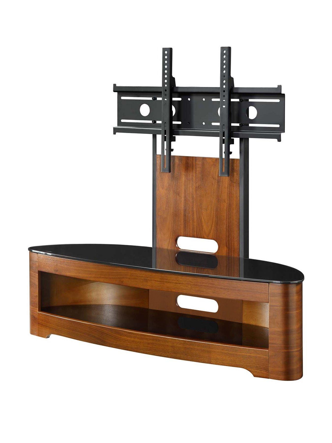 Jual Florence TV Stand in Grey or Walnut Wood VeneersThis modern JF209 Florence TV stand by Jual is a sleek and stunning way to show off your audio-visual set-up.It comes in a choice of grey or walnut veneers, so you can go with a modern or more traditional appearance in your lounge. Each one has a sweeping curved shape as well as contrasting piano black glass top for a splash of light-catching shine. The universal cantilever bracket suspends your TV in the air, so the unit's top can be used for your sound bar, games console or set-top box. The lower shelf is detailed with a matching glass finish and creates extra space fore more peripherals. Cable management cut-outs allow wires to be neatly passed through, maintaining the stylish appearance. Please remember to measure your available space before ordering. Dimensions: Height 123, Width 123, Depth 46 cm