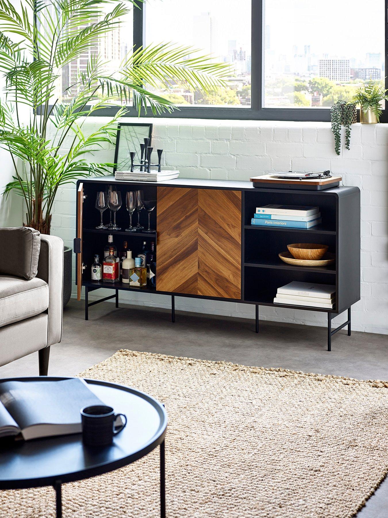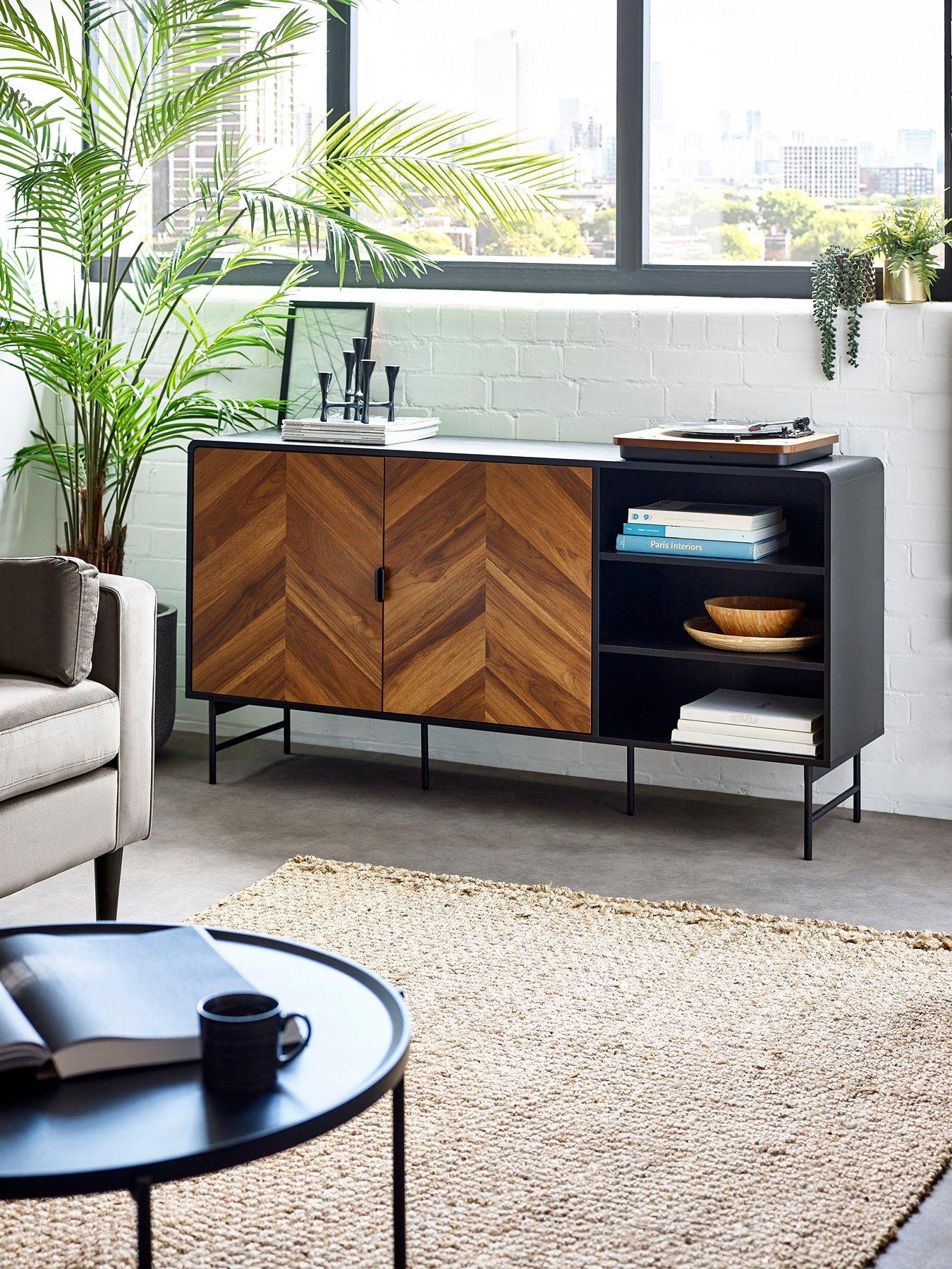 Julian Bowen Alvin Black And Natural Wood-effect SideboardMake a statement with this striking sideboard, adding both style and smart storage to your space. The bold chevron warm wood-effect doors are framed by smooth curved edges and finished with sleek black edge handles for a refined look. Two open shelves offer easy access to display or store items, while the two doors open to reveal large shelves inside, providing generous hidden storage in this versatile cabinet. Supported by slim black metal legs, the piece feels light and airy, making it a perfect addition to living rooms, dining areas, or hallways. Self-assembly required.