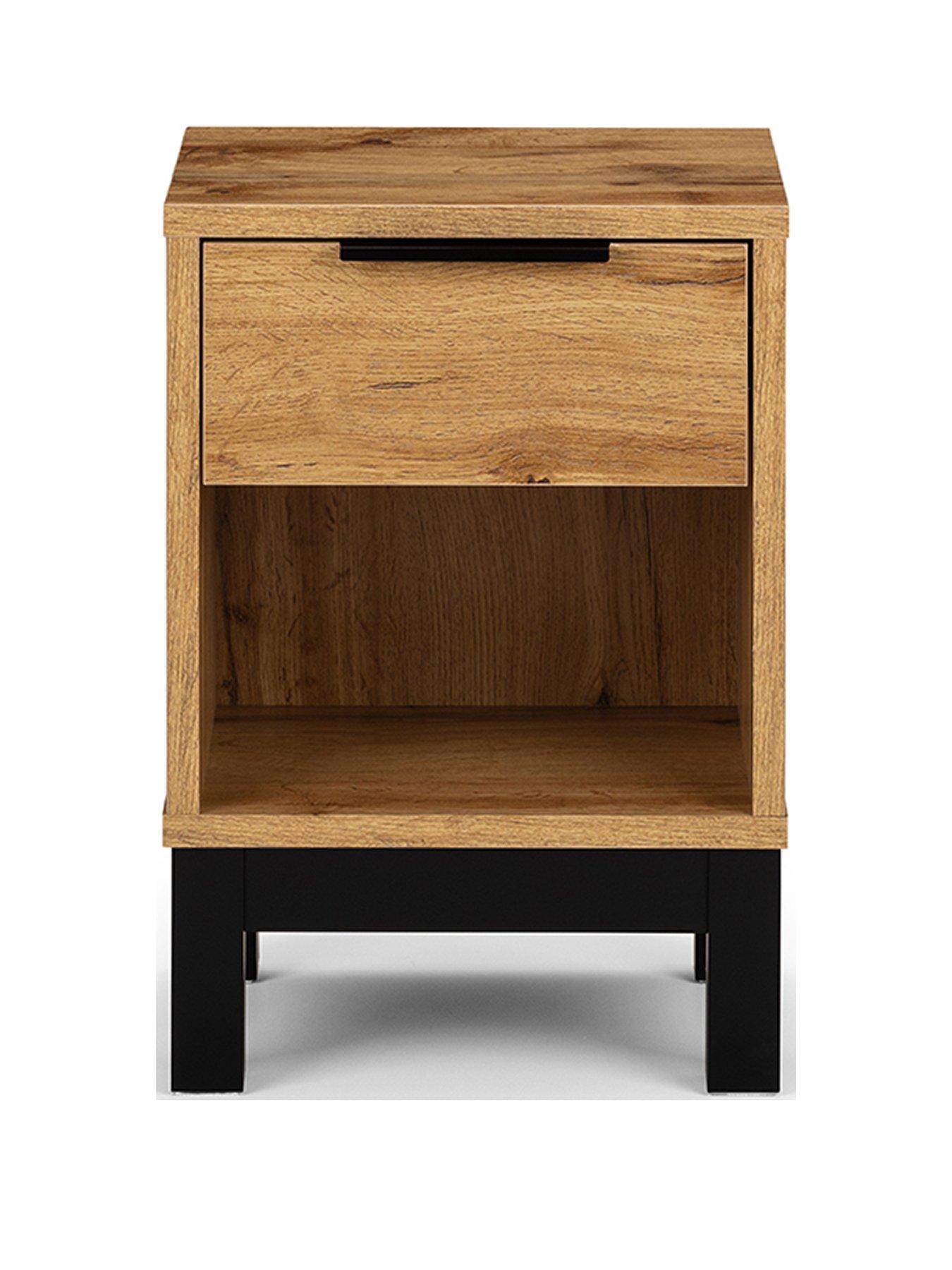 Julian Bowen Bali 1 Drawer Bedside in Oak EffectThis modern bedside chest from Julian Bowen's Bali collection features a stunning look with a richly grained oak-effect finish. This is eye-catchingly contrasted by the black base and a matching handle to create a fashionable appearance in your bedroom. The single drawer is complemented by an open storage cubby that's perfect for books, ornaments and more.Extra contemporary points comes from the click assembly tech which allows you to put it together with ease. Matching furniture is available separately, search 'Bali' to see the full range. Please remember to measure your available space before ordering. Dimensions: Height 50, Width 35, Depth 26 cm