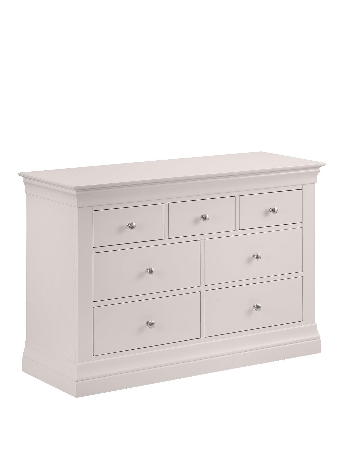 Julian Bowen Clermont Ready Assembled Wide 4 + 3 Chest of Drawers in White or GreyPart of Julian Bowen's Clermont collection of bedroom furniture, this chest of drawers arrives ready assembled in a choice of striking lacquered finishes. You can choose from white or grey, each of which has a smart neutral quality that allows you to match it with your existing colour scheme.The mix of solid pine and MDF instil the furniture with Sturdiness, and its classic French styling is characterised by a waterfall edged top and chunky plinth. Four large and three small drawers are fitted with dainty metal handles and allow you to neatly separate tees, socks, underwear and more. Please remember to measure your available space before ordering. Dimensions: Height 120, Width 80, Depth 45 cm