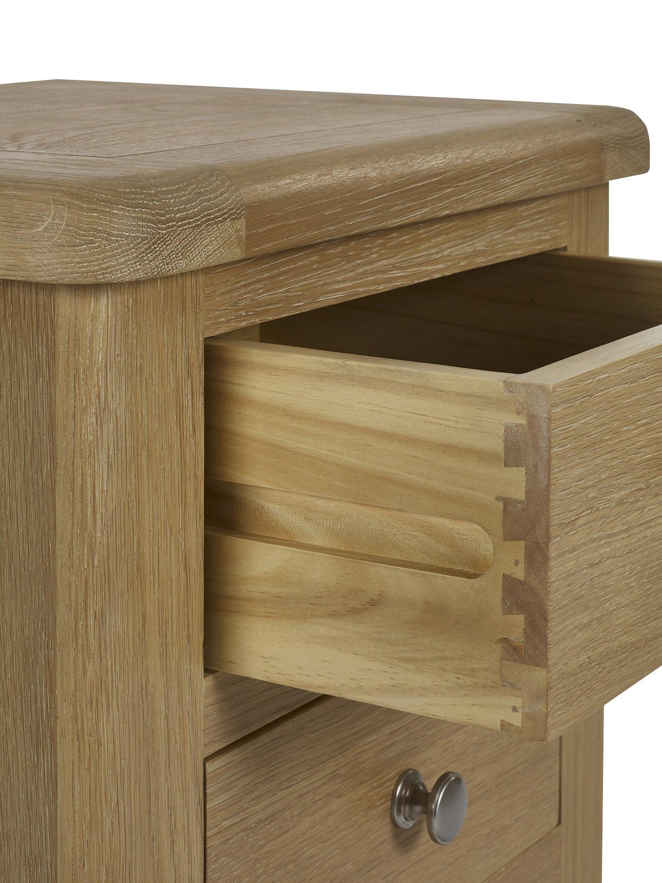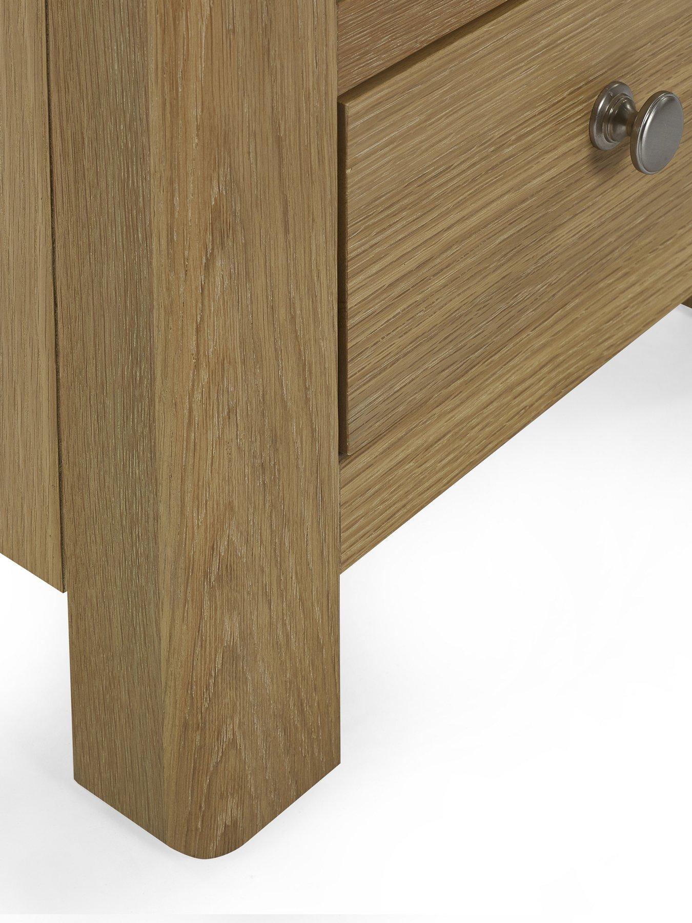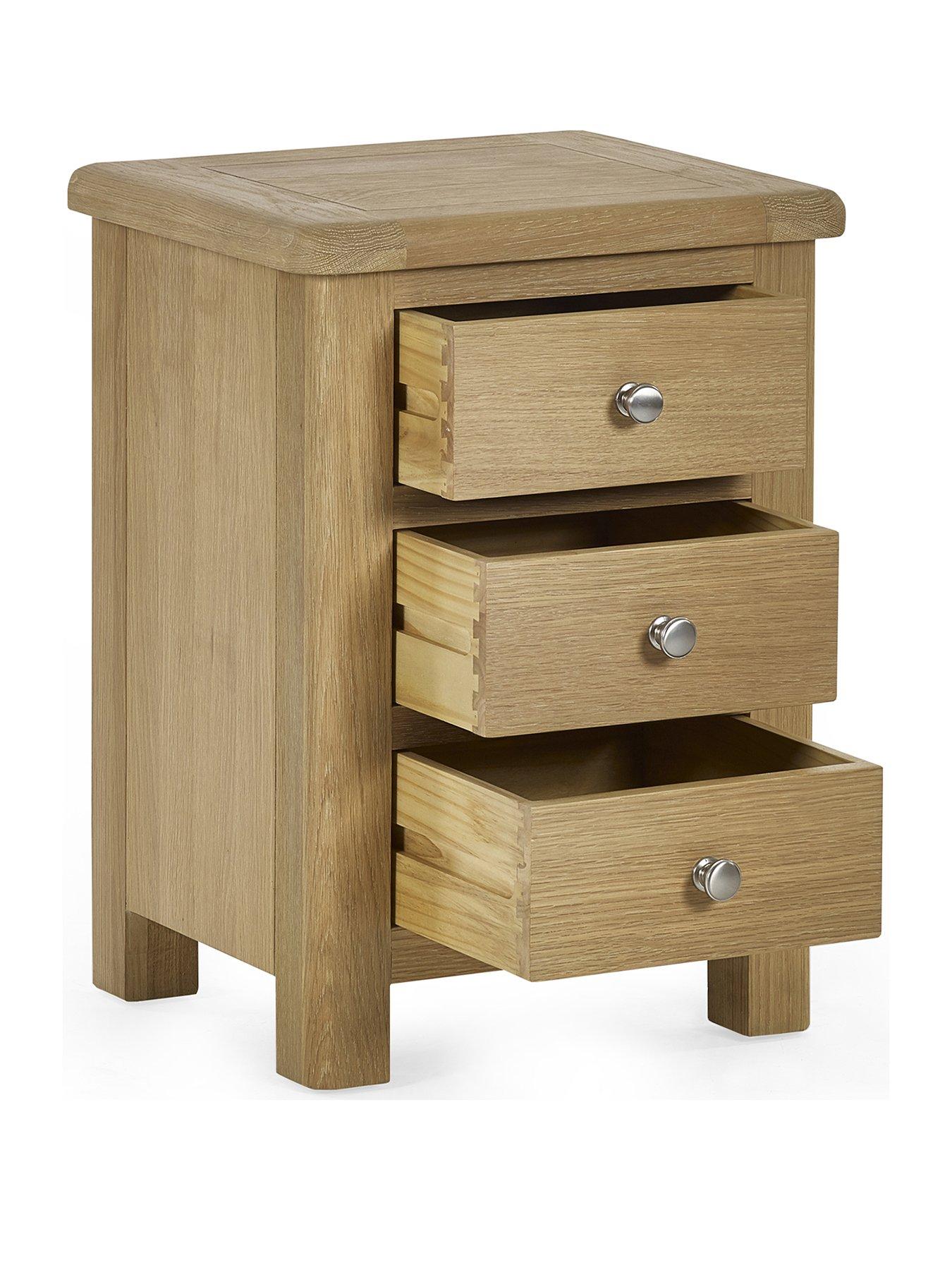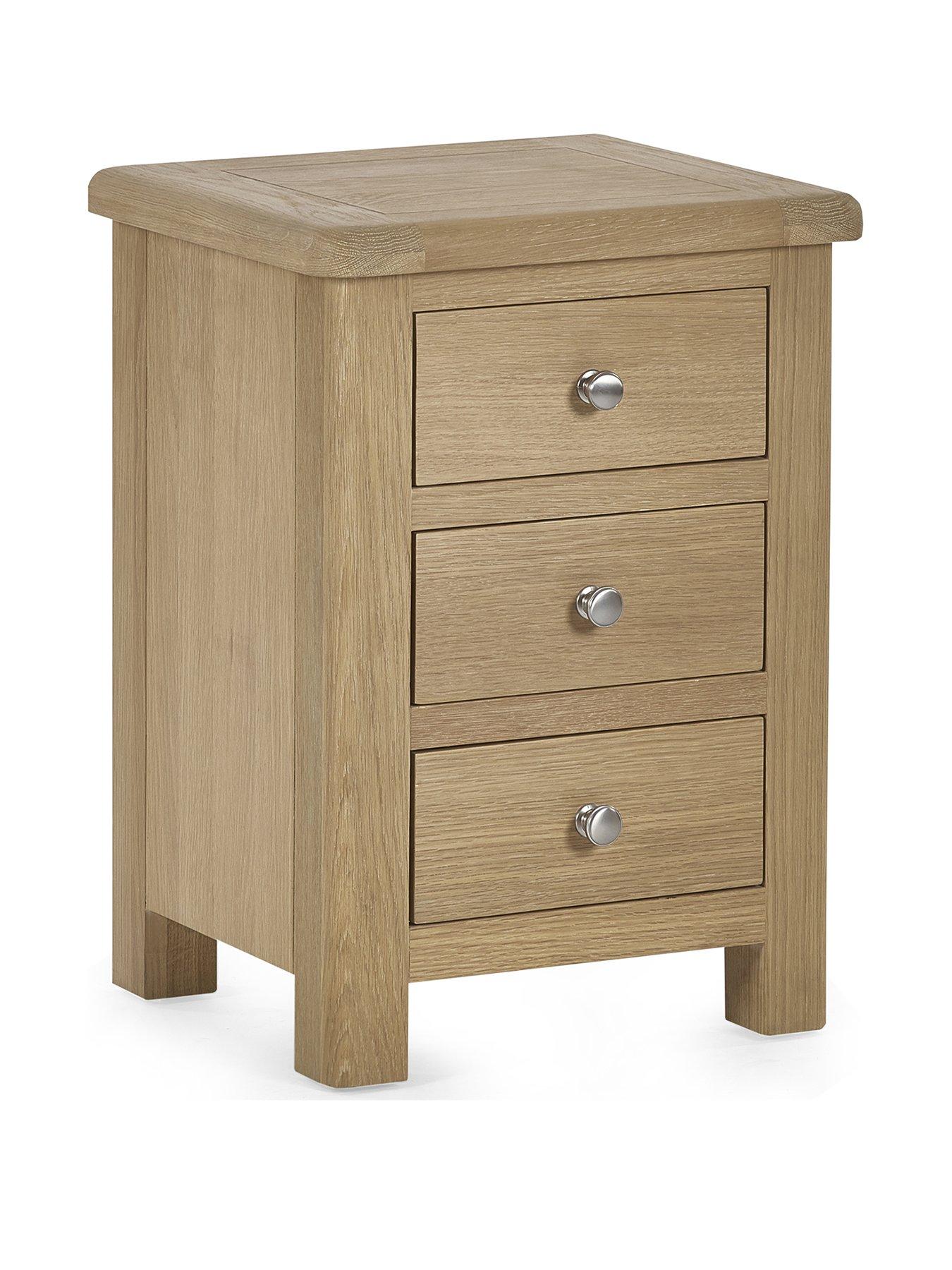 Julian Bowen Memphis Limed Oak 3 Drawer BedsideThe Memphis 3 Drawer Bedside is finished in a gorgeous limed oak, providing a smooth curved edging that will add a timeless look to any bedroom space. This sleek design features three pull-out drawers offering storage space for key necessities at hand reach which are elegantly finished with bulbous polished silver handles.