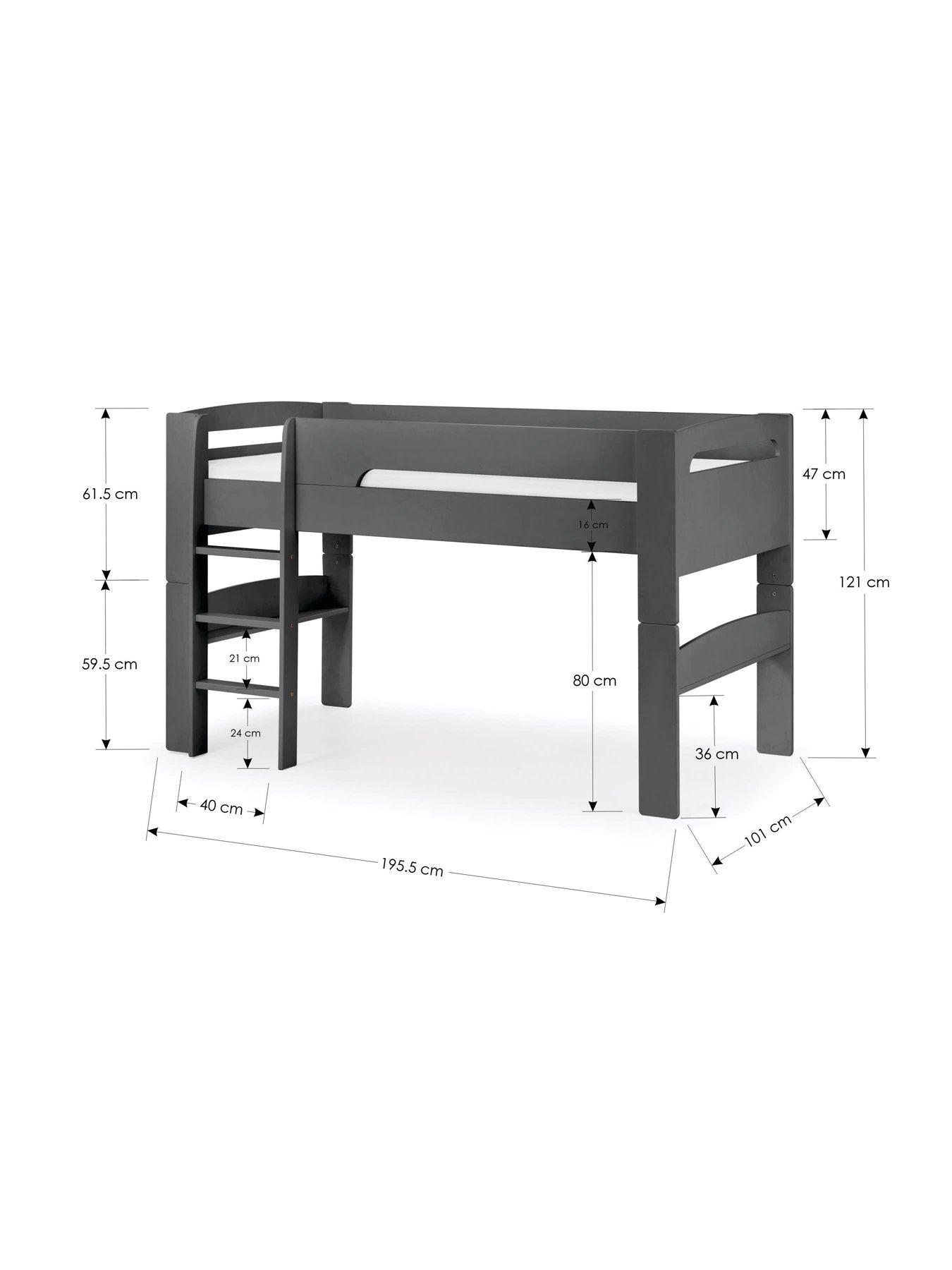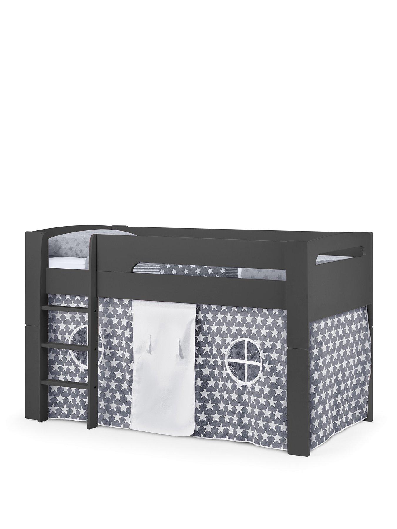 Julian Bowen Nova Anthracite Midsleeper Bed With Grey Star TentCreate a bold and modern look with this midsleeper in anthracite, paired with the grey star tent. The deep grey finish adds a stylish edge, while the strong wooden frame ensures long-lasting support. Designed with flexibility in mind, the ladder can be fixed to either side, and the frame easily converts into a single bed when needed.The matching grey star tent turns the space underneath into an exciting hideout, offering the perfect spot for games, books, or a cosy retreat. With its playful roll-up door and peek-through windows, it brings fun and character while keeping the space inviting. Easy to attach and remove, it's a simple way to add a touch of adventure to everyday routines. No assembly required for the tent. Bed requires self assembly. Mattress sold separately.