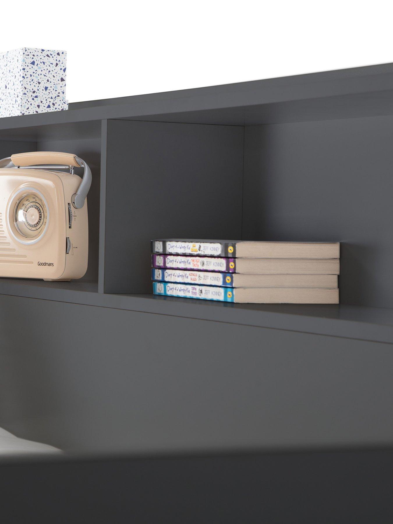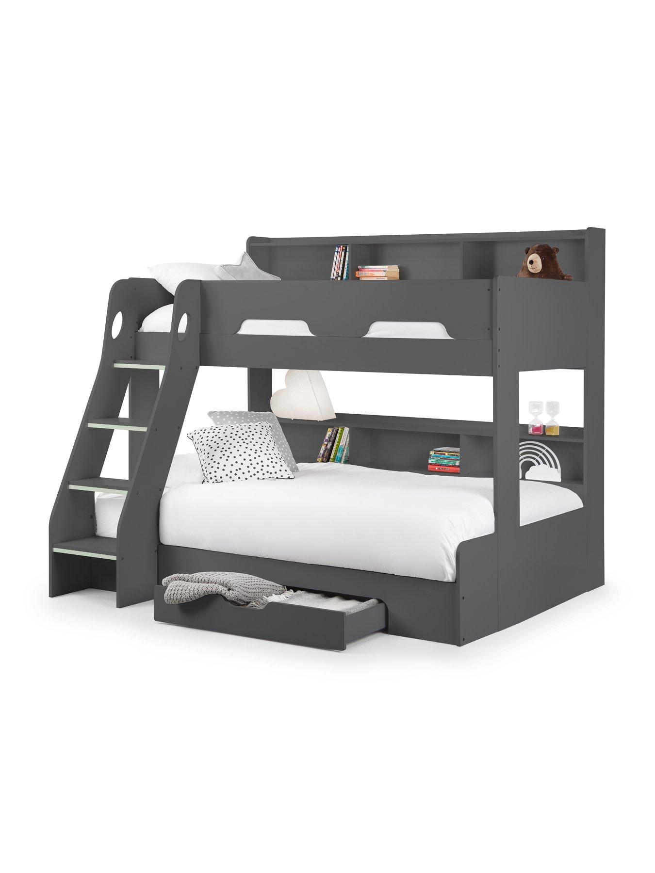 Julian Bowen Riley Triple Sleeper Bunk Bed with Storage Drawer and Shelves in AnthraciteWith enough room for three sleepy children, the Riley bunk bed by Jumian Bowen comes in a stylish anthracite colourway that will go with all sorts of bedding designs and room decors.The bunk includes a small double bed at the bottom and a single bed at the top, which are connected with an angled ladder that makes climbing up and down easy - especially when you fit the optional glow in the dark strips that help to light their way at night. Smart shelving next to each of the beds is the perfect place to keep bedtime books and other essentials close to hand, while a storage drawer at the base allows them to organise spare bedding, toys, games and so much more! The cut-out handles on the drawer front is matched by the handles at the top of the ladder. Please note: mattresses must be purchased separately. Please remember to measure your available space before ordering. Dimensions: Height 171, Width 169, Depth 196.5 cm