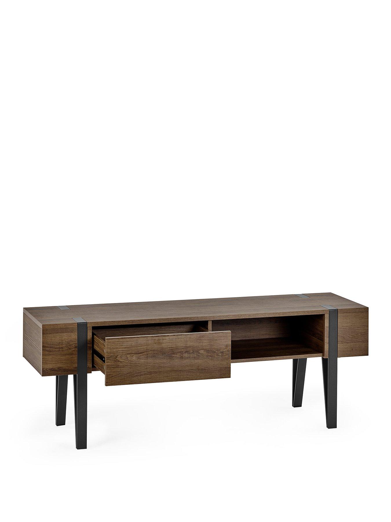 Julian Bowen Troy Tv Unit Up To 65"Add authentic industrial charm to your living space with this TV unit. Its wide top surface easily accommodates TVs up to 65 inches, making it a striking centrepiece. The rustic wood effect finish highlights natural grain and unique imperfections, giving the piece its own character and warmth. A convenient push-touch drawer and open shelf provide handy storage for media essentials, while the matt black hairpin style legs add a rustic modern edge. Minimal assembly required.