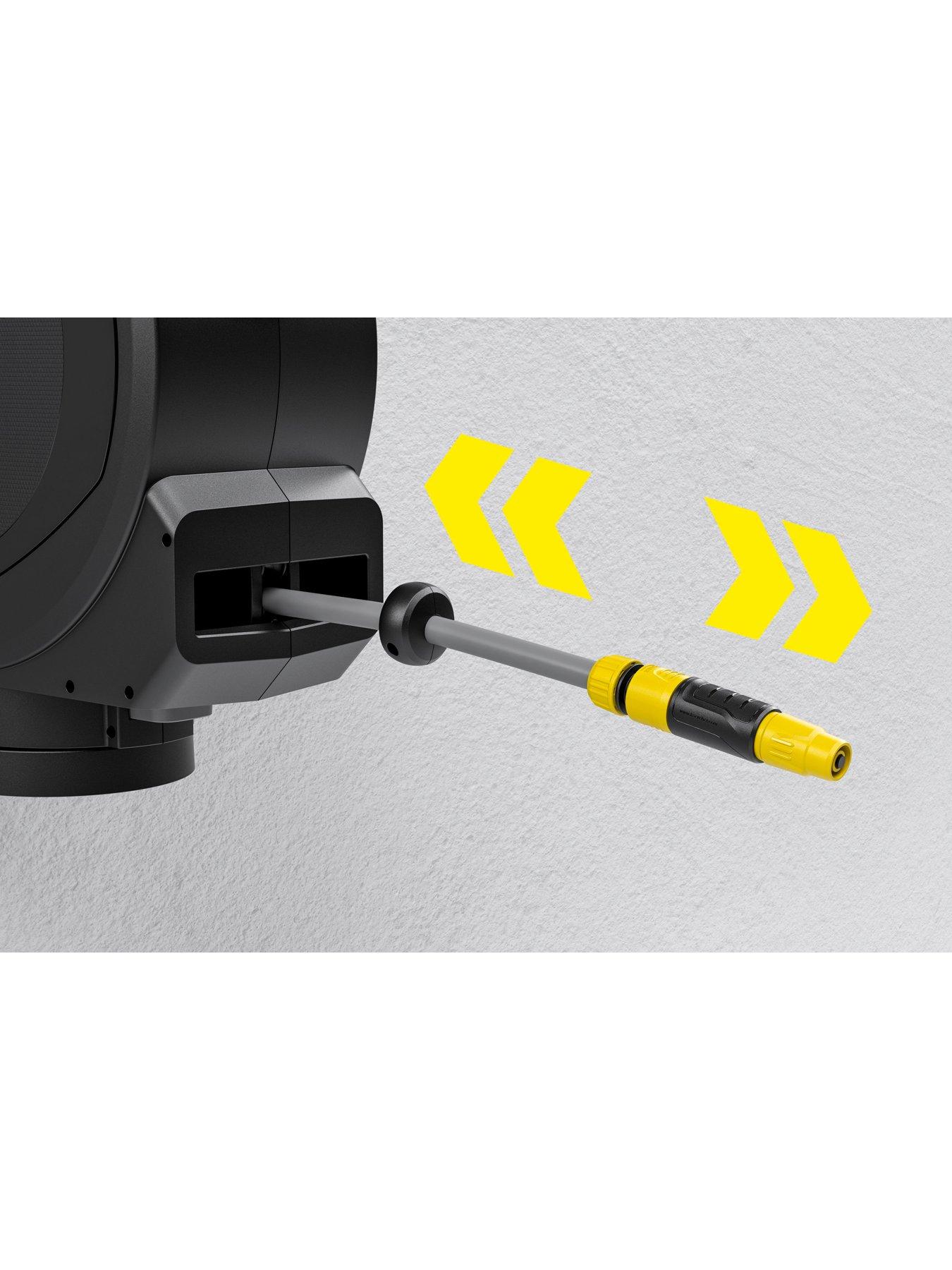 Karcher HBX 5.30 Automatic Hose BoxAlways perfectly stowed away: the stylish hose box is mounted on the wall to save space and is connected to the tap with a connection hose. Thanks to the wall bracket, the hose box can even be swivelled through more than 180° and therefore effortlessly reaches every corner of the garden. The garden hose can be easily extended to a maximum length of 30 metres. There are corresponding locking stages: the hose engages fully automatically at short intervals. Gently pulling on the end of the hose releases the locking mechanism so that the hose retracts automatically and in a controlled manner, without kinks or knots. The hose box also scores points with FlexChange, an innovative mounting system for easily switching the hose box between the wall bracket and hose spike. The wall bracket is also removable and has slots for nozzles and watering accessories. The hose box is also UV and frost-proof and can therefore be placed on the wall of your house all year round. A cable lock can be fitted to prevent theft.