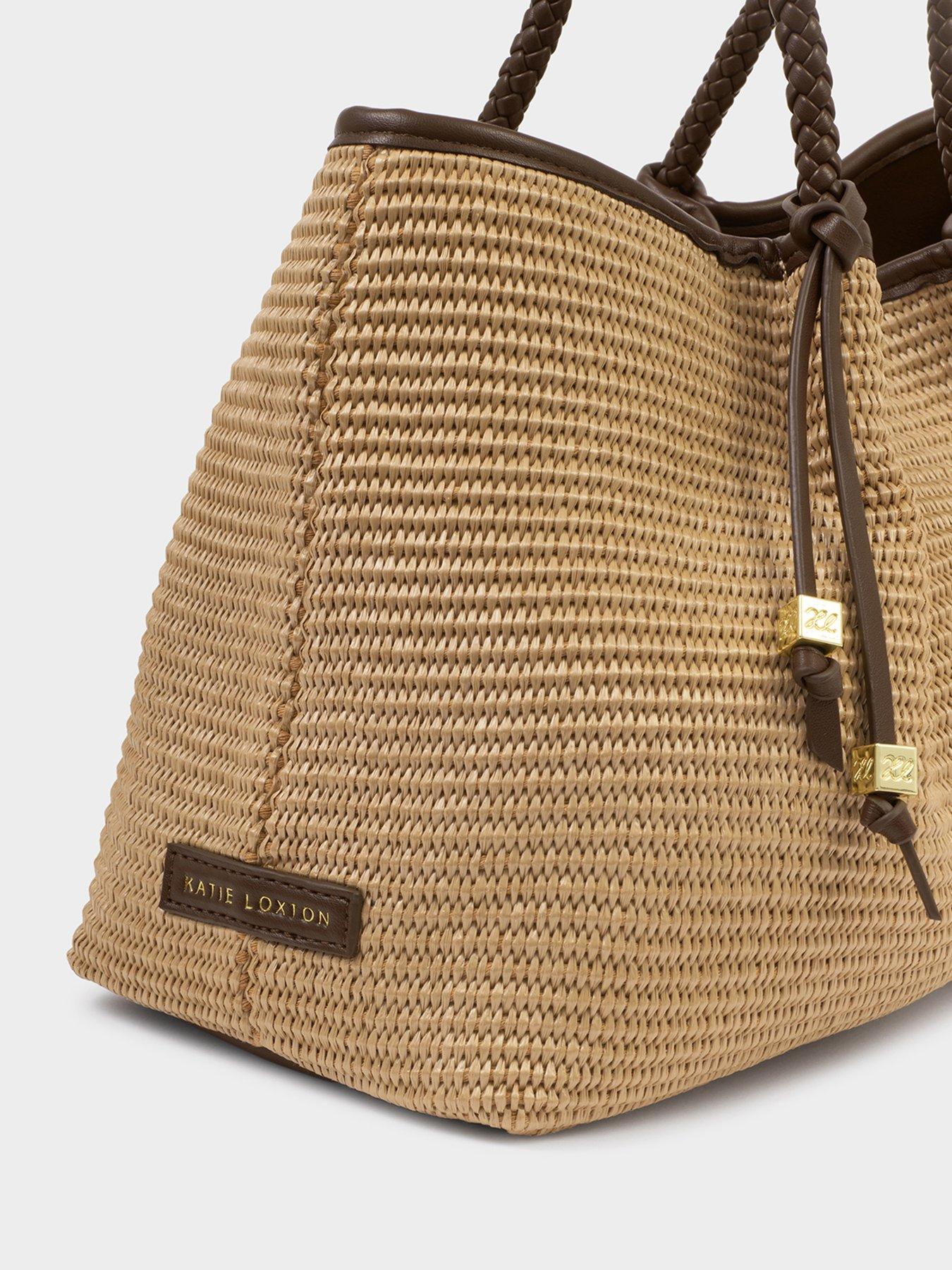 Katie Loxton Nova Raffia Small Shoulder Tote- Natural Raffia / Bitter Chocolate22.5cm X 36cm X 14cm. The Nova Small Shoulder Tote in Bitter Chocolate is perfect for lightweight summer styling. Featuring a natural raffia material, a signature branded bag charm, and long comfortable handles that make it easy to carry over the shoulder. Complete with a secure magnetic closure, it adds a touch of understated elegance to any outfit. Add initials with our matching Personalised Bag Charms.