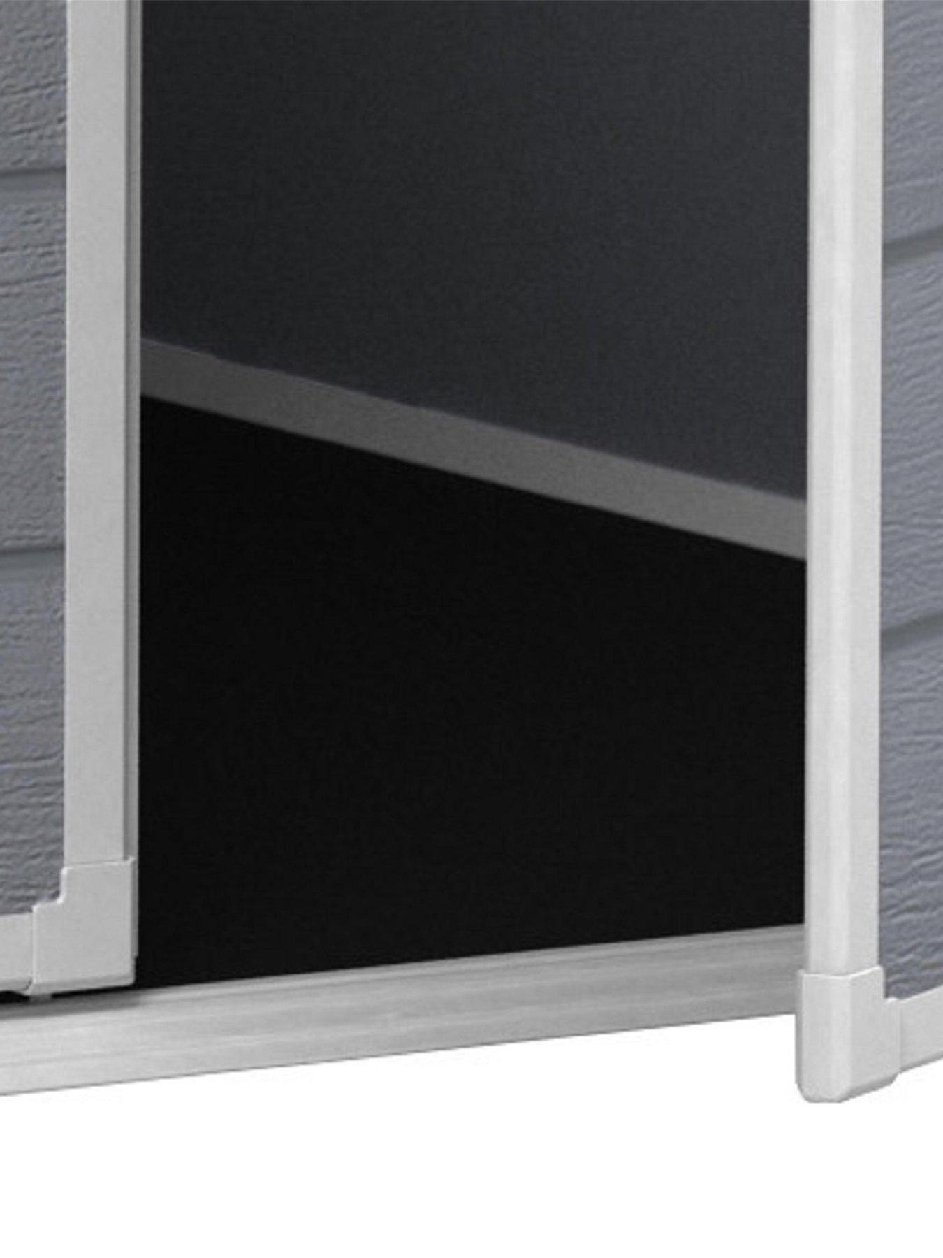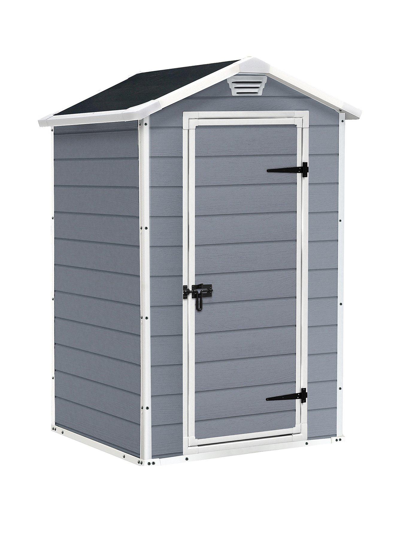 The Keter 4x3 ft Apex Manor Resin Shed gives you dry, secure storage in a compact design.The Manor is a durable storage shed with a double wall construction made of fully weather-resistant resin. A floor panel keeps the bottom of items clean and dry. This shed is also ventilated and lockable for excellent security.Ideal for small outdoor spaces, this compact Keter Shed can bring storage to the tightest spaces, such as the one between your house and fence, and is ideal for storing garden tools, BBQs, and outdoor toys. Keep your garden clutter-free and your items protected.