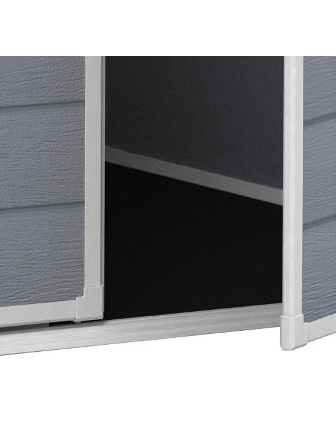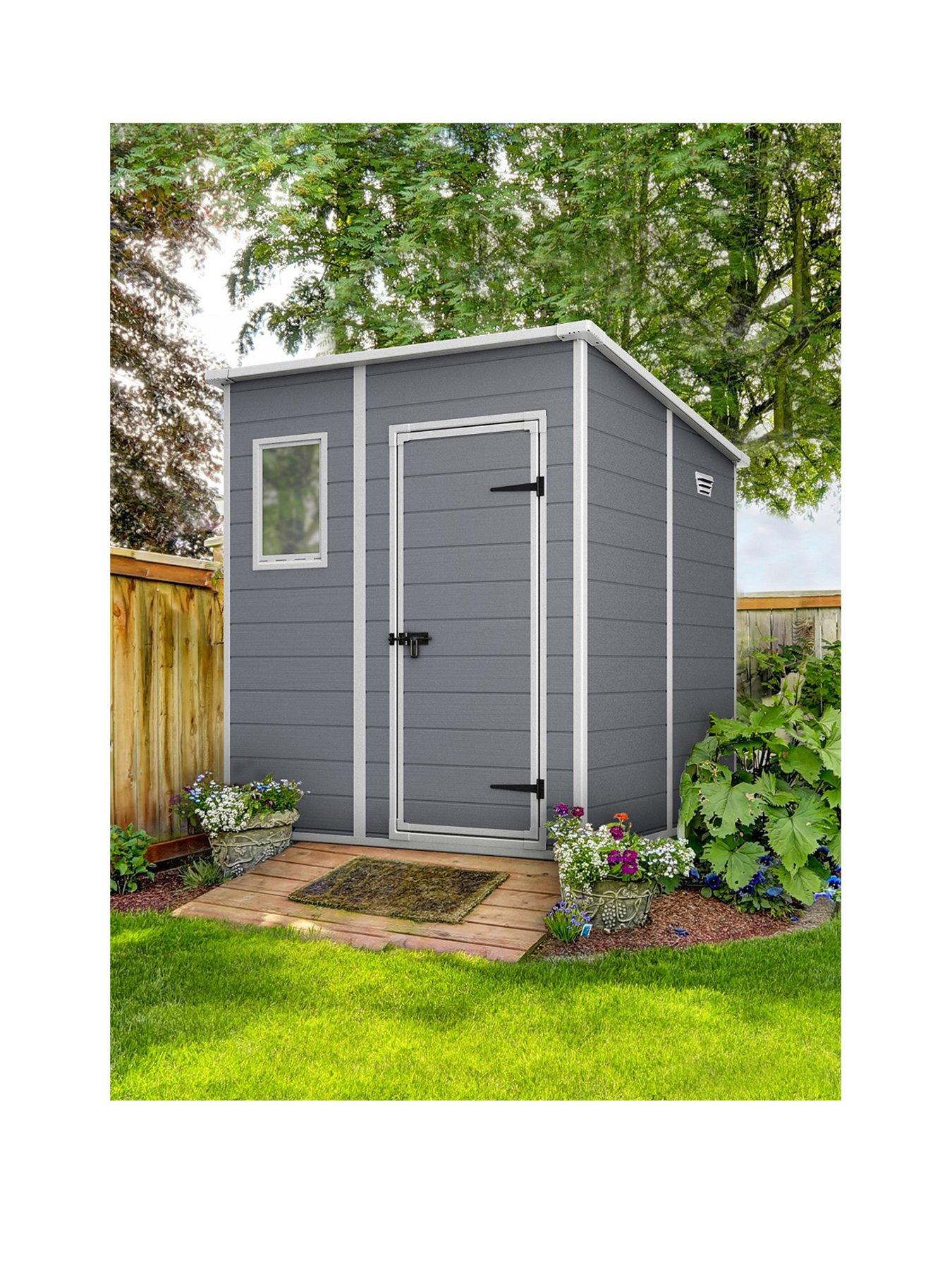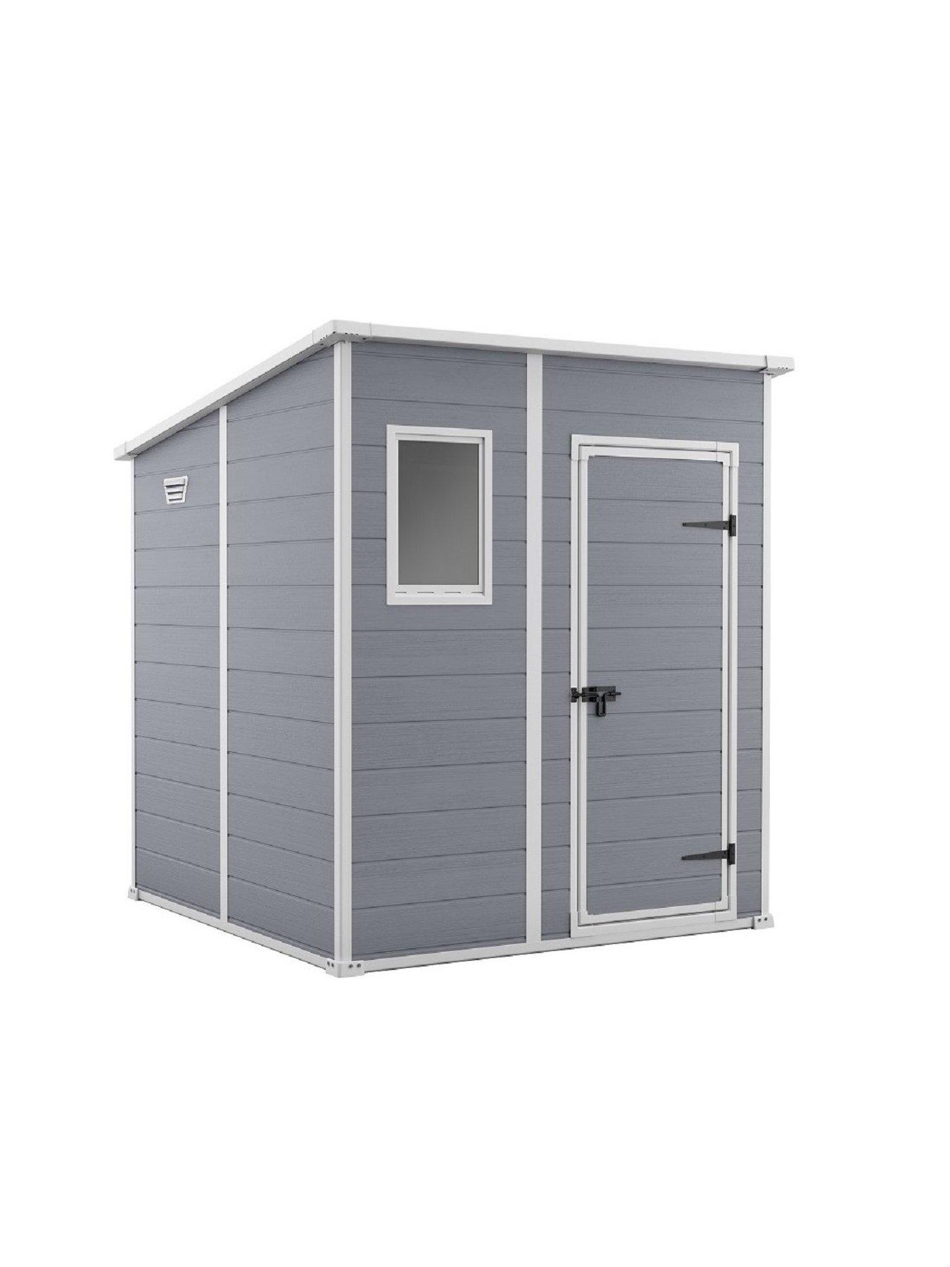 Store your garden items safely with the sturdy Keter Manor Pent 6x6 ft Shed.The Manor is a durable storage shed with a double wall construction that is fully weather-resistant. It also features double doors for easy access, floor panel, built-in ventilation for safety, a fixed window for natural light and has a locking system to provide added security for your items. Its maintenance free as it will not rust, rot dent or peel. Floor panel protects content against mud and rainwater.Ideal for small to medium gardens, the Manor Shed is ideal for storing garden tools, furniture, BBQs, bikes and outdoor toys. Keep your garden cluitter free and your items protected.