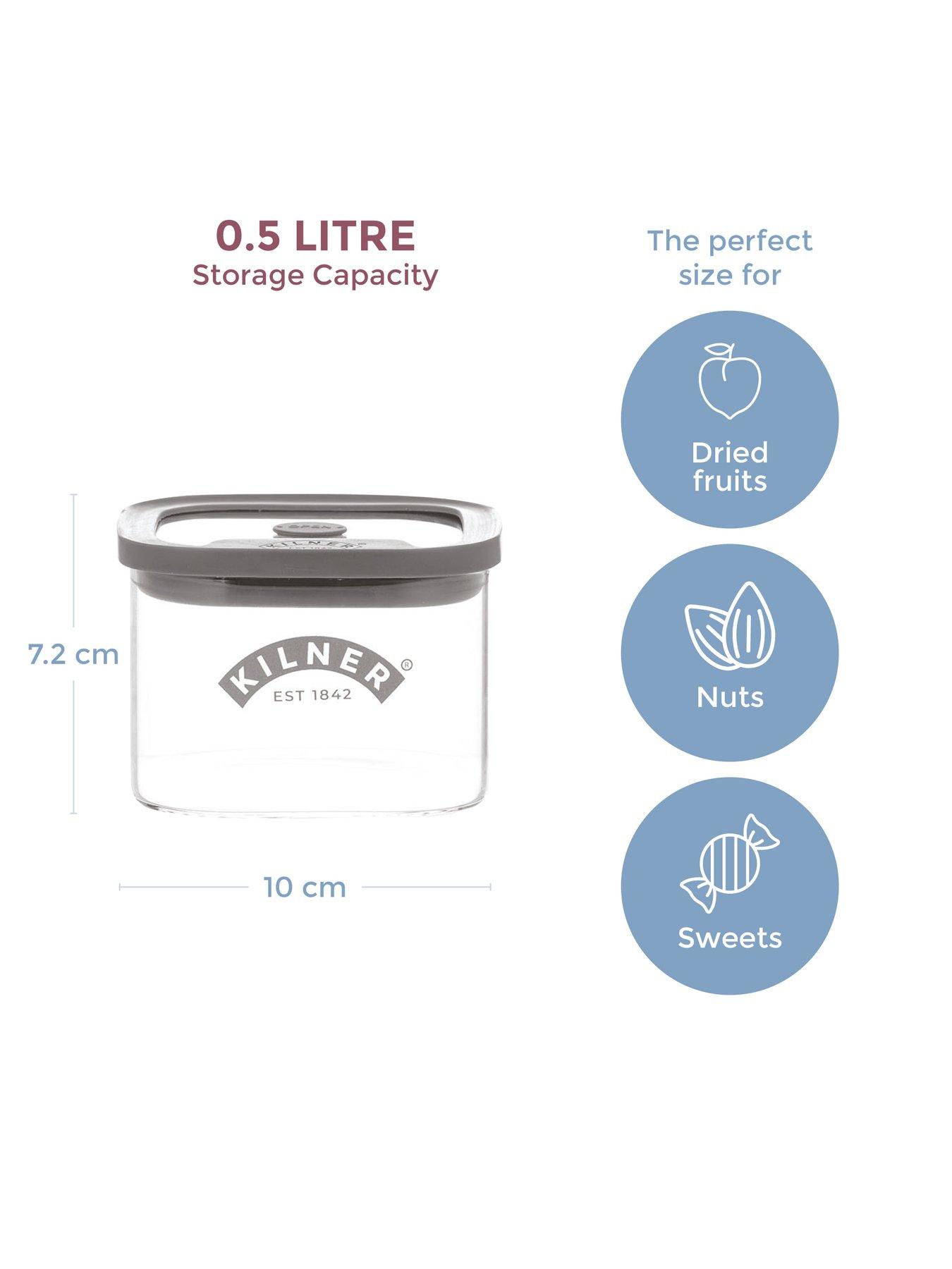 KILNER Fresh Storage Set Of 4 Square Jars 0.5lCreate a stylish and organised kitchen with the new Fresh Storage Jar Collection. This comprehensive range of borosilicate glass containers offers everything you need for keeping dry foods fresher for longer.Designed to be light weight with square shape corners for easy pouring, the lid is made from tempered soda lime glass, which is easy to push on and pull off. The unique silicone valve creates a strong vacuum seal maintaining ultimate freshness. Glass is the best material to store foods with no chemical leaching and BPA free. The clear body lets you see the contents at a glance with space on the jar body and lid to add labels of your choice. The 500ml jar is perfect for storing smaller foods such as dried fruits, nuts and sweets. They also stack neatly for space efficiency for pantry, cupboard or worktop. This set contains 4 x 0.5l jars. Other sizes in the range include 160ml, 1 litre, 1.5 litre, 2 litre and 3.5 litre. This new range co-ordinates with the original Fresh Storage Collection with matching signature grey silicone lids.