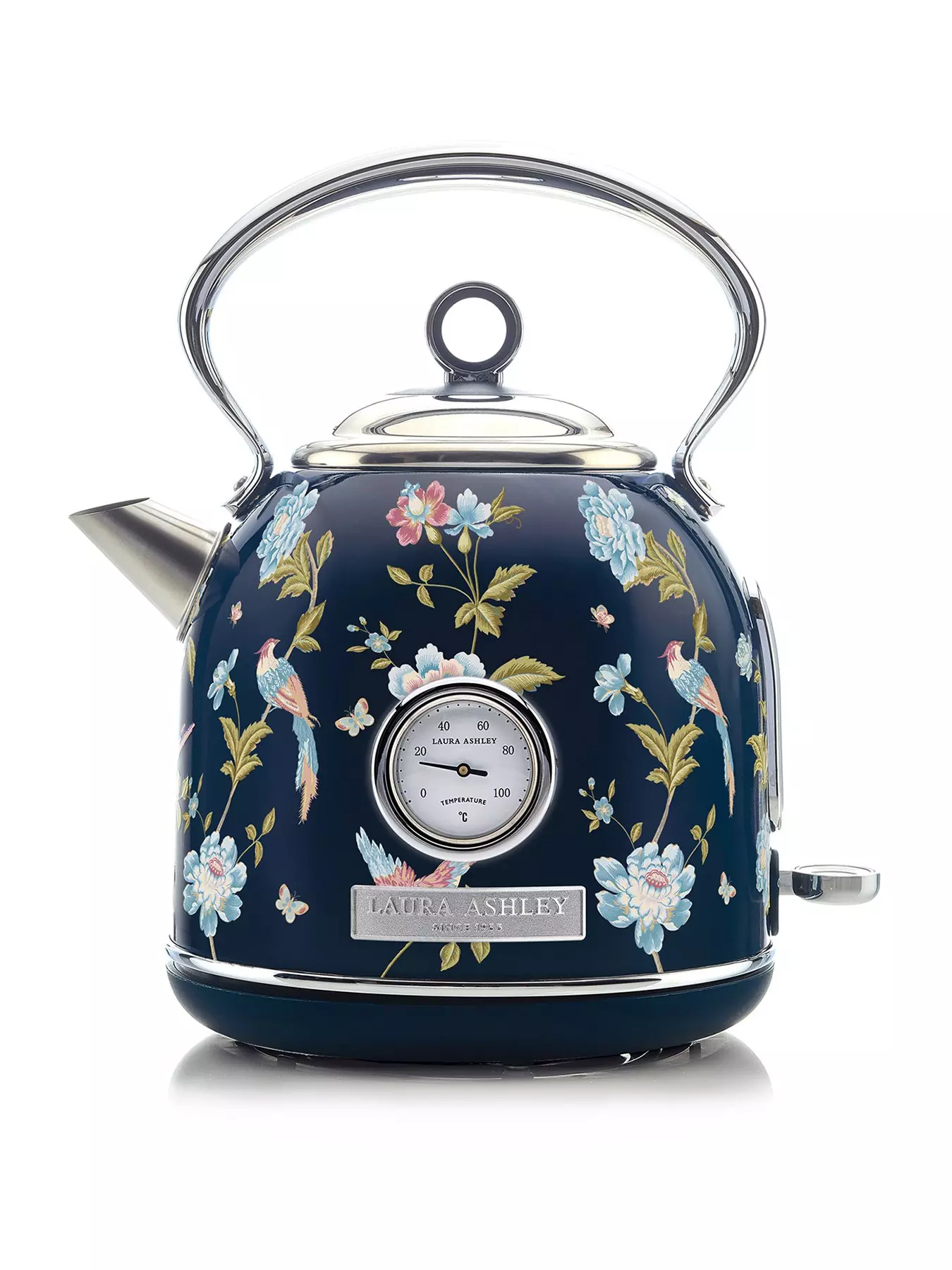 HAND DECORATEDThe elegant VQ Laura Ashley Dome Kettle is a truly iconic addition to your home. Radiating timeless grace, it comes seamlessly wrapped (by hand) in Laura Ashley's classic Elveden Navy print. Each kettle is hand decorated and finished with a high-grade gloss UV coating to ensure it looks pristine day in day out. The chrome handle is more than just a touch of elegance: it offers a sturdy and reliable grip too.
