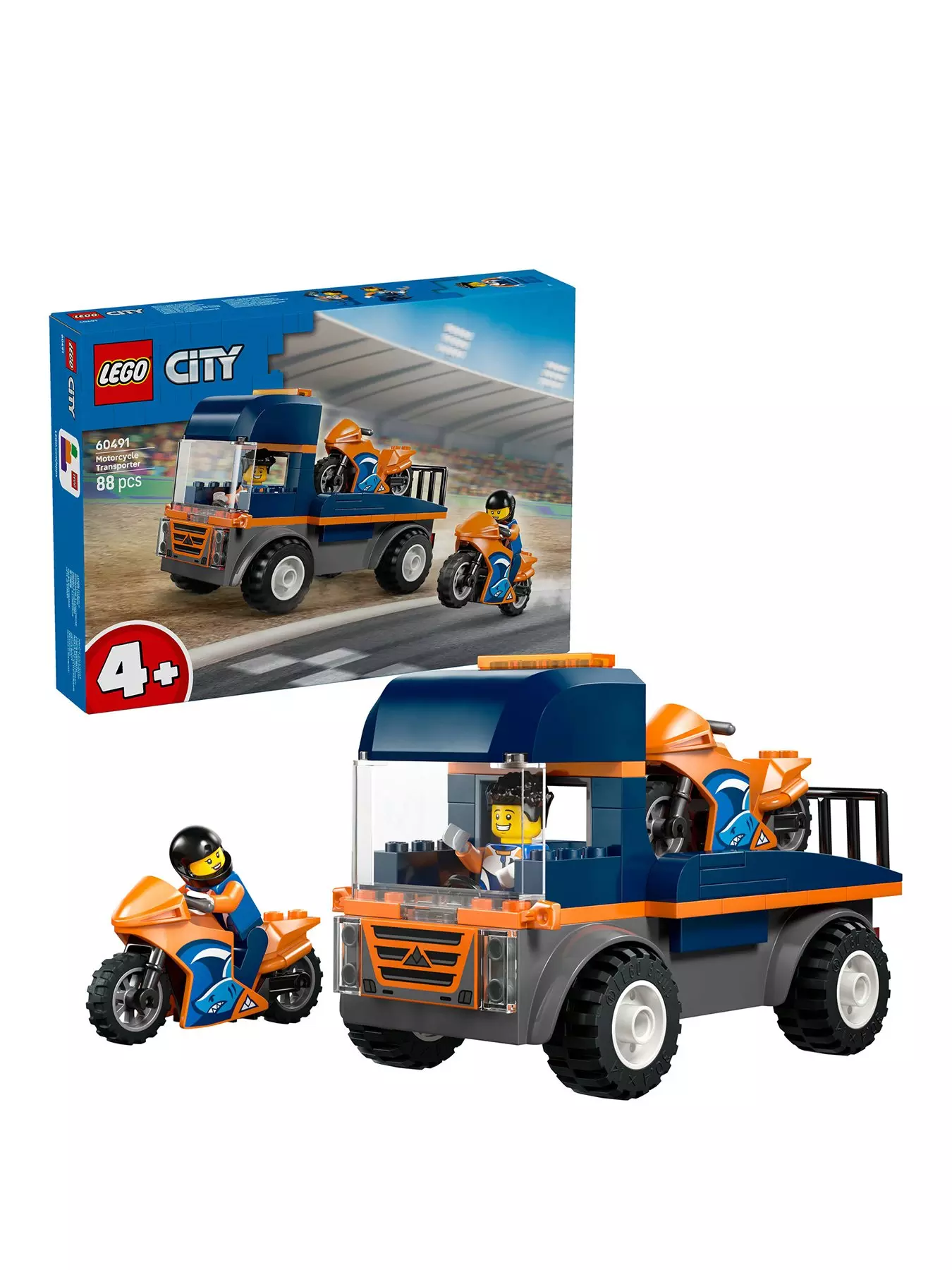 Introduce kids aged 4+ to a world of imaginative play with the LEGO® City Motorcycle Transporter (60491) toy building kit. This toy vehicle playset includes a flatbed truck toy with chunky rubber tyres, 2 sporty motorcycle toys and 2 racer minifigures with helmets. Kids can load and unload the bikes using the ramp, play out epic motorcycle race action and seat a minifigure in the cab for fun on-the-road adventures.This easy-build toy playset includes a LEGO Starter Brick element, a simple pictorial guide and 3D instructions in the LEGO Builder app - a digital building companion with zoom and rotate tools that enable kids to visualise models from all angles as they build.