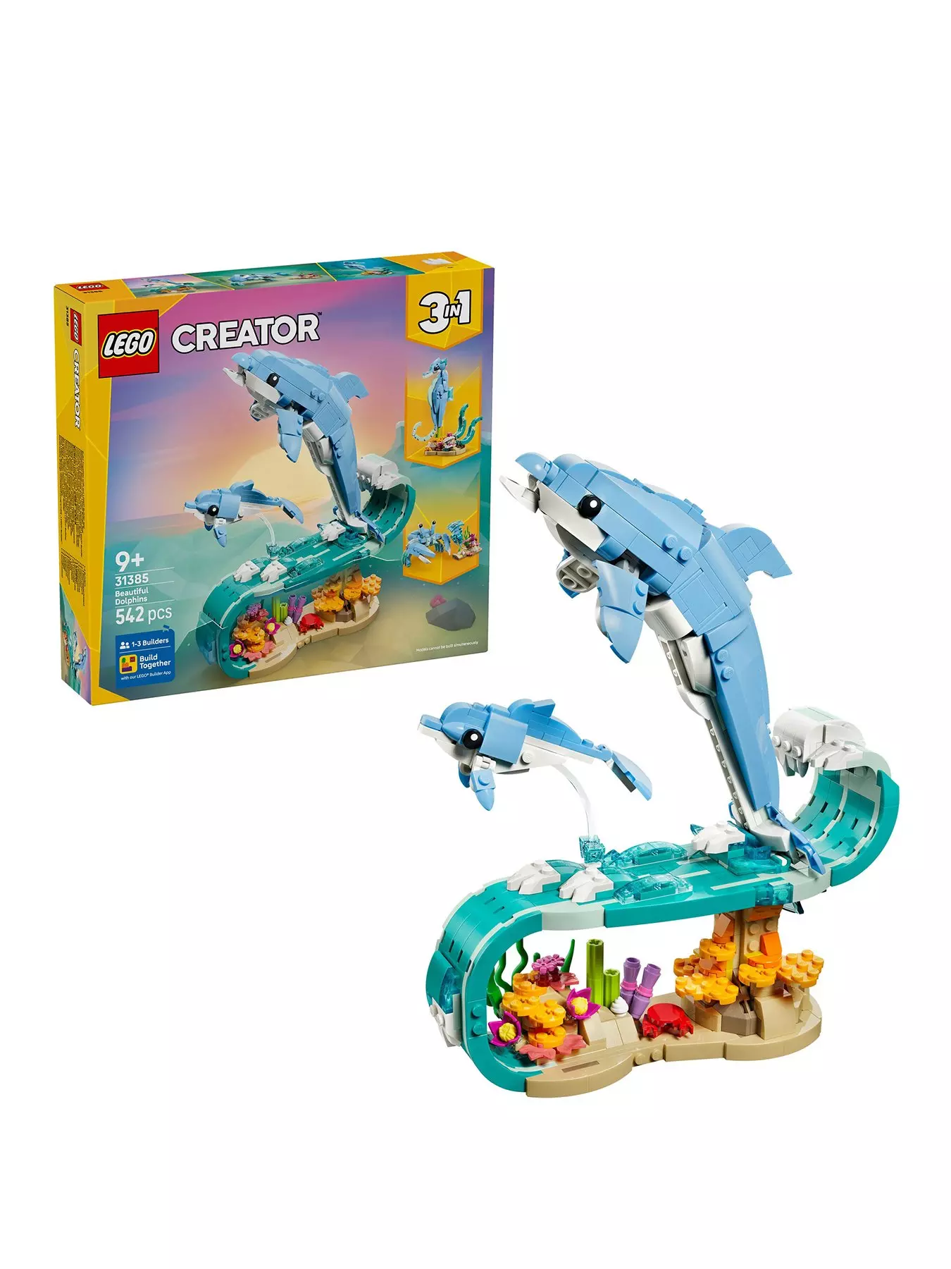 LEGO Creator 3in1 Sea Animals: Beautiful Dolphins (31385) building toy for 9+ year old girls and boys lets kids play out fun-filled stories. This sea animal figures playset offers 3 different building options with the same set of LEGO bricks.They can choose to build a dynamic model showing an adult and baby dolphin toy with posable features riding a cresting wave above coral. This can then be rebuilt into a posable seahorse on a colourful stand featuring seaweed and a posable clam, or a crab toy next to sea plants and a jellyfish. Once playtime is over, each sea animal figure can be proudly displayed as eye-catching nature decor on a shelf or desk.