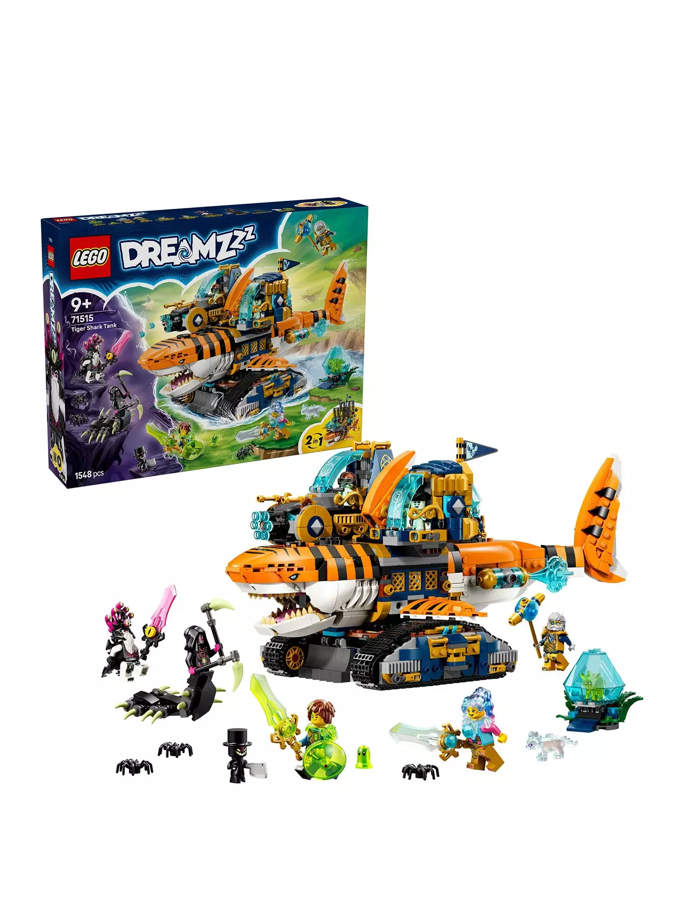 Ignite imaginations with the LEGO DREAMZzz 2in1 Tiger Shark Tank toy for 9+ year old boys and girls (71515). The building set offers 2 options, so kids can create a tiger shark tank or tiger shark pirate ship toy.The tiger shark tank in this action toy has an opening mouth, movable tail and 2 side pods with shooters, storage and room for a LEGO minifigure pilot, while the tiger shark ship has a front cannon, side shooters, an opening mouth, treasure storage in the back and an anchor accessory. Mateo, Izzie, Mr. Oz, the Nightmare Emperor and Arika LEGO DREAMZzz minifigures encourage pretend play and have sword accessories. There's also a diamond egg, plus collectible Green and White Treasure Creatures, Z-Blob, a Grimspawn, 2 dreamling figures and 3 spiders.