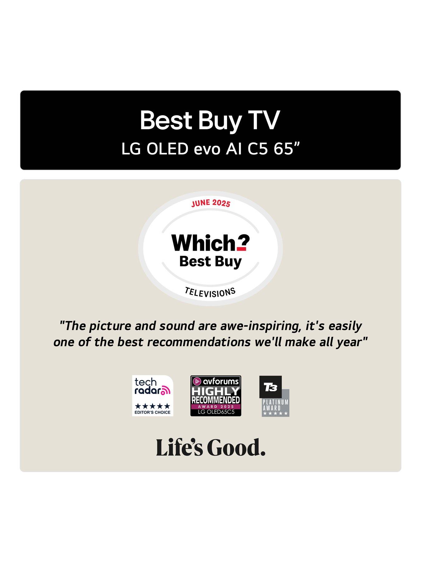 LG OLED65C55LA, 65 inch, OLED 4K UHD, Smart TVC5Advanced OLED processor for optimised pictures and sound LG OLED C5 features the latest a9 AI Processor: the brain of the TV. This advanced processor is made for OLED, intuitively ensures premium picture and sound quality and delivers image enhancement through AI Super Upscaling. It will also upscale audio for a more cinematic experience. Enhanced brightness Thanks to an advanced Light Boosting Algorithm - Brightness Booster - you can enjoy incredibly bright images, ensuring a stunning picture no matter how bright or dark your room. Perfect Black LG self-lit OLED is the pinnacle of TV technology. All of the screen's pixels are self-lit allowing for perfect contrast, 100% colour accuracy and volume, and the sharpest pixel-perfect details, creating the ultimate viewing experience. With a certified perfect black, you will never again lose out on important detail in the dark scenes of a movie - regardless of whether you're viewing at night, or during the day. Additionally, LG OLED enables uncompromised picture quality at any viewing angle so everyone in the room can enjoy the same stunning images regardless of where they sit. OLED technology also provides a safer and more comfortable viewing experience thanks to its flicker-free technology and certified low blue light levels. This means less fatigue to your eyes during boxset marathons, nail-biting championship games and intense gaming sessions.