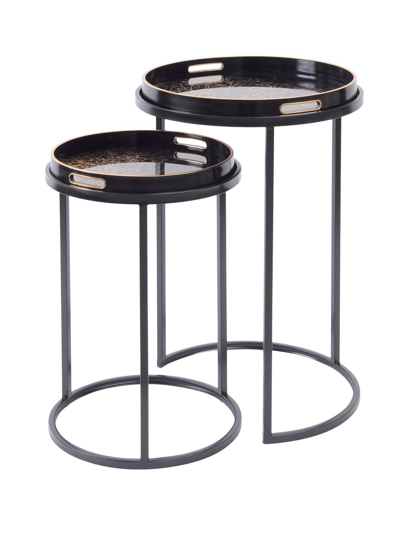 Libra Interiors Coral Design Set Of 2 Side Tray TablesShowcasing a simple, elegant design, this set of two nested side tables have a beautiful antique patina. Finished by hand, they feature a soft gold frame and removable tray tops. Perfect for placing alongside a sofa or armchair. Large table 48 x 48 x 69. Small table 39 x 39 x 57 (WxDxH cm)