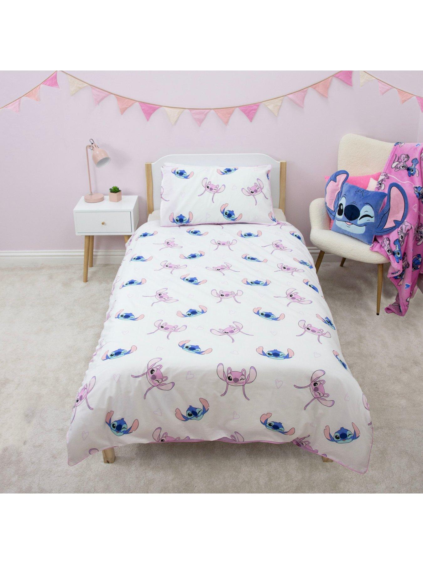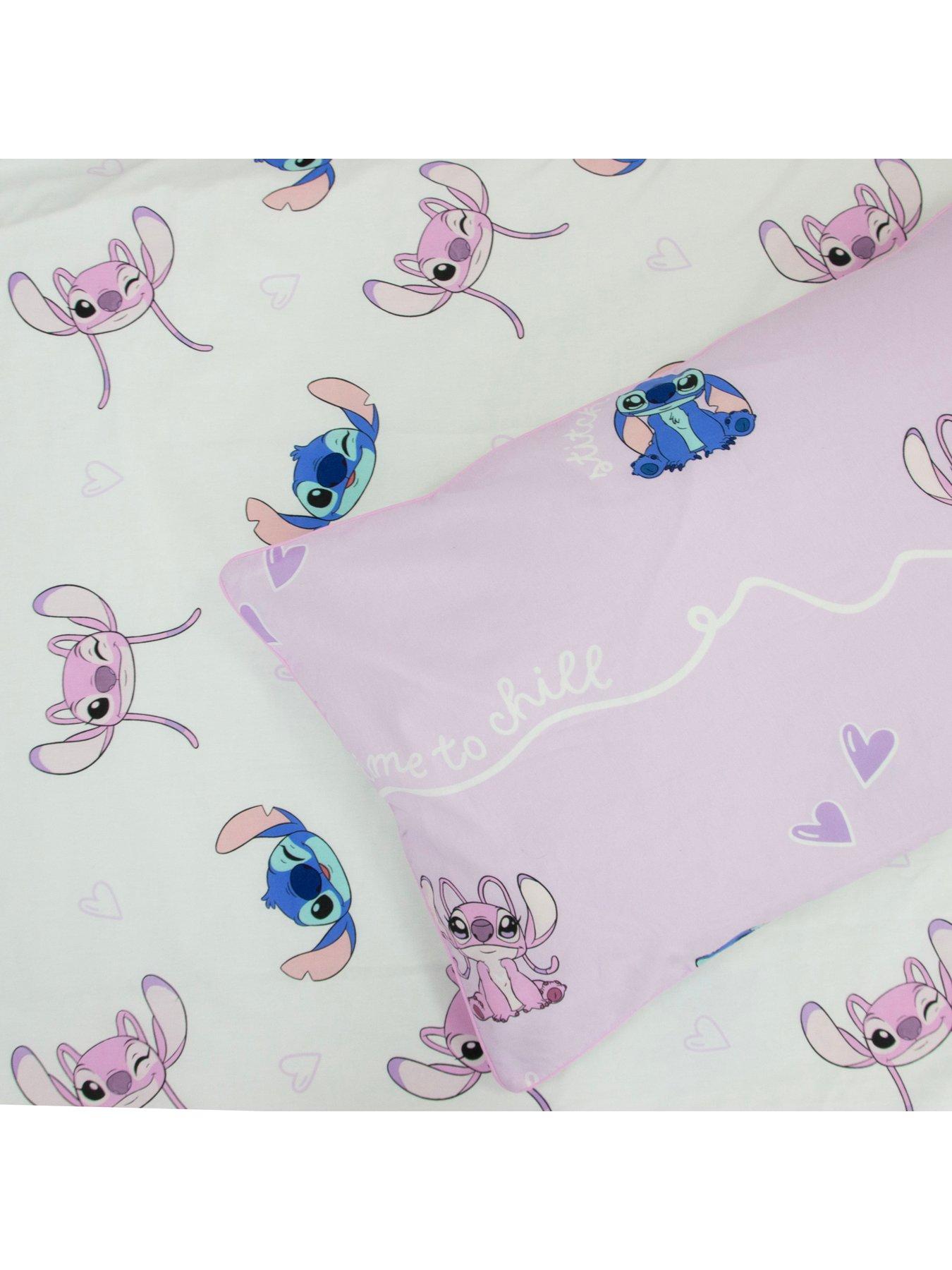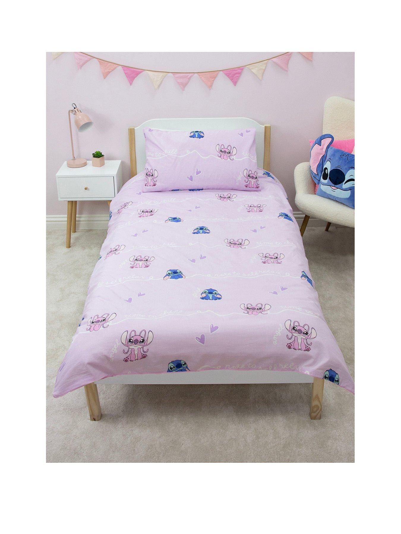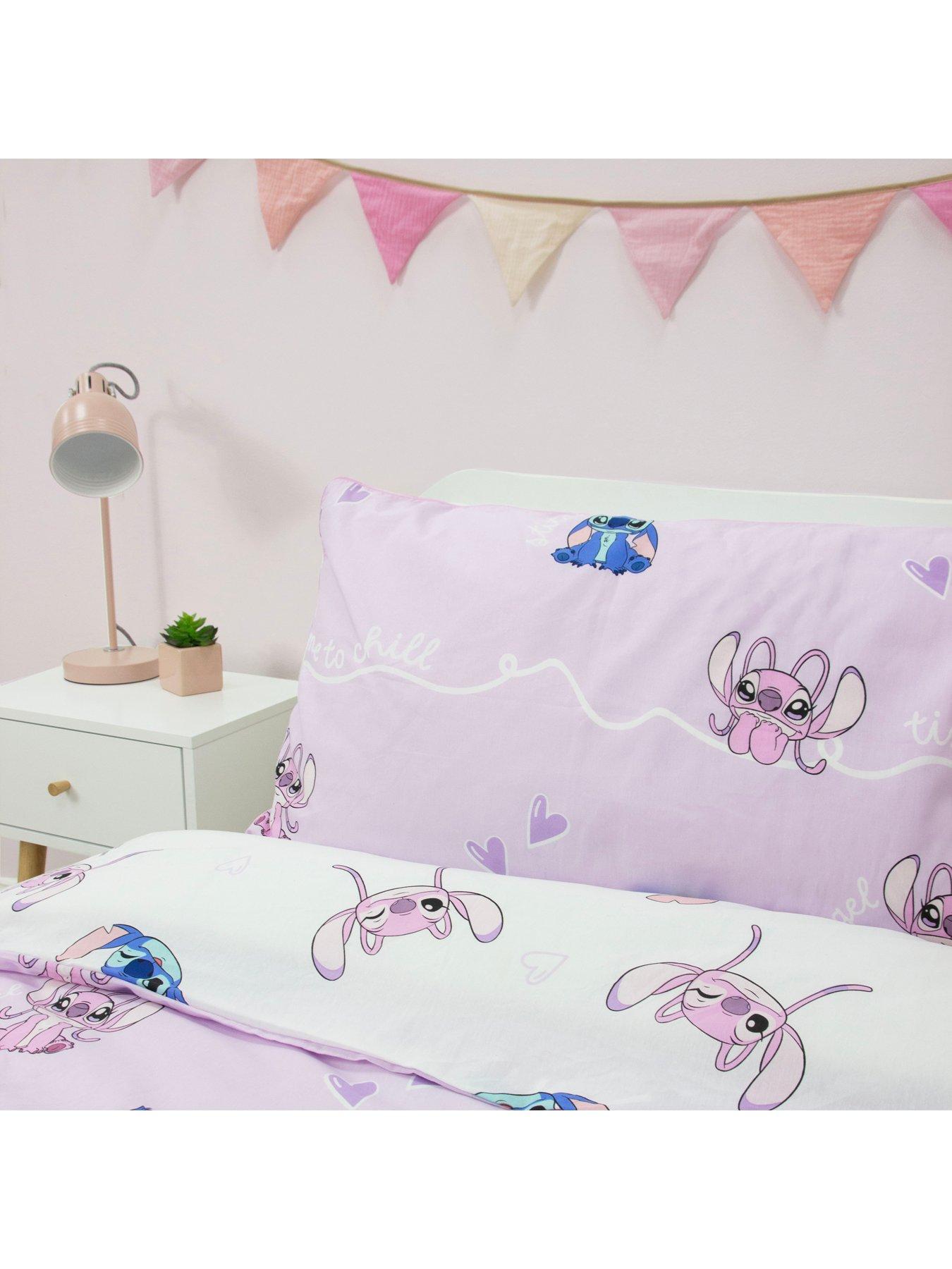 Lilo & Stitch Lilo & Stitch Chill Rotary Duvet- SinglePacked with chaotic energy and adorable charm, Disneys Lilo & Stitch are impossible not to love. This officially licensed Lilo & Stitch bedding set is designed for single beds and includes a reversible duvet cover and pillowcase to easily freshen up the look of your childs bedroom. The front side of the duvet cover features a repeating pattern of Stitch and Angel from Lilo & Stitch with string stripes and hearts on a lilac background that runs on to one side of the pillowcase. The reverse side features a repeating pattern of Stitch and Angel with love hearts on a white background that runs on to the pillowcase. The bedding and pillowcase have a pink piping trim around the seams. The bedding is made from polycotton and printed to a high standard. The duvet cover has popper fasteners so its easy to remove to wash and remake afterwards. The duvet cover and pillowcase are machine washable, and tumble dryer safe. Designed for single beds, this Disney Lilo & Stitch duvet cover measures 135 x 200cm, and the pillowcase is a standard UK size of 74 x 48cm