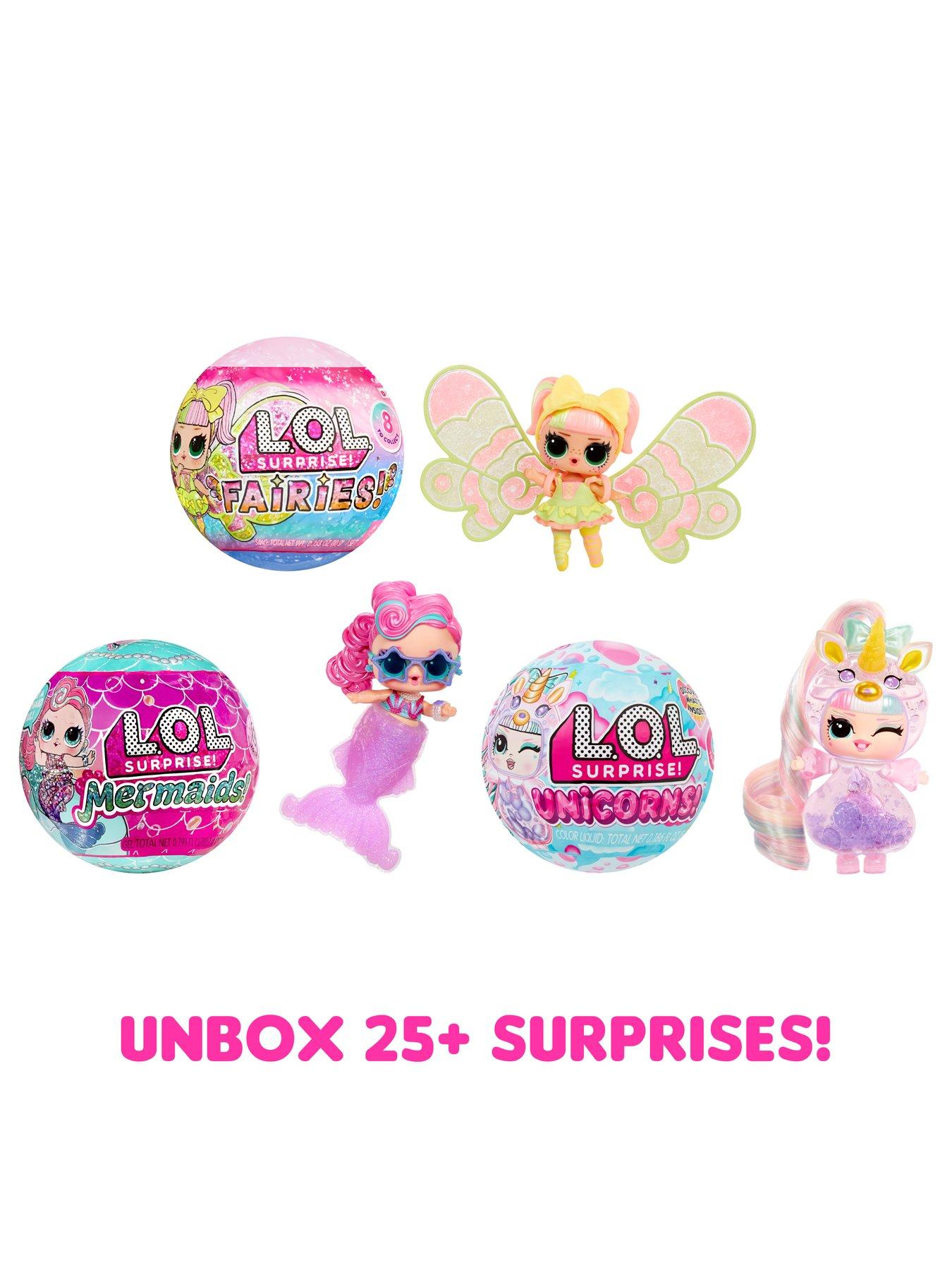 L.O.L Surprise! L.O.L. Surprise Just Add Water 3-PackGet ready to dive into a magical world with the adorable L.O.L. Surprise Just Add Water 3-Pack with customizable fantasy character dolls including 1 glamorous Mermaid Tot, 1 sparkly Fairy Tot, 1 cute Unicorn Tot, and 25+ surprises! This hands-on, creative experience is the perfect magical collectible for kids, providing a simple introduction to imaginative crafts. Add water to unlock the magic of each doll! Unbox 25+ surprises to find 3 Tots dolls, 3 magical craft experiences, and tons of fashionable accessories! All 3 LOL balls have something new to discover! Unbox 1 LOL Surprise Mermaids Tot, 1 LOL Surprise Fairies Tot, and 1 LOL Surprise Unicorns Tot! Each Tot has sweet features, a unique hairstyle, and her own stylish outfit. When playtime is over, the L.O.L. balls double as display stands to show off your tots and their beautiful designs! Discover what's inside and collect the complete L.O.L. Surprise fantasy character set with this 3-pack!L.O.L. Surprise collectible dolls with stylish hair, outfits and many detailed accessory pieces make a perfect toy for kids, including 4 years old and up for imaginative pretend play! As gifts for any special occasion, dolls provide hours of social play with siblings and friends! From MGA Entertainment, creators of L.O.L. Surprise fashion and collectible dolls, Rainbow High fashion dolls, Na Na Na Surprise dolls, Bratz fashion dolls, MGA's Dream Ella, MGA's Glitter Babyz, Lalaloopsy, Baby Born Surprise baby dolls and collectibles, Little Tikes kids toys and many other favorite brands.
