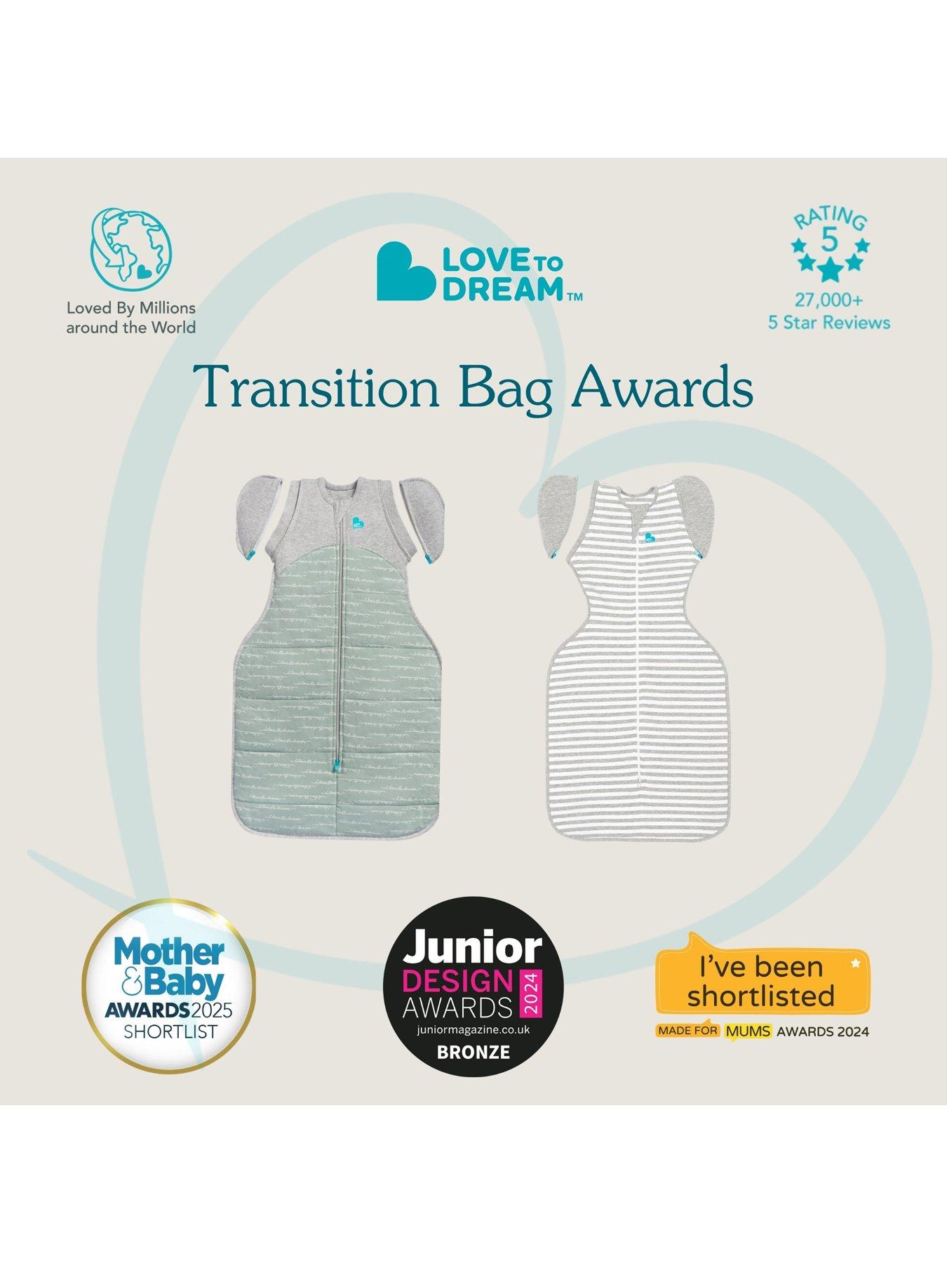 Love To Dream Swaddle UP Transition Bag MediumWhen your baby begins to roll, it's time to transition from swaddling to arms-free sleep. The Swaddle Up Transition Bag simplifies this shift with removable zip-off wings, allowing a gradual adjustment. This award-winning design combines the comfort of a swaddle with the ease of a sleep bag. Its soft, stretchy fabric provides a cozy feel, while the ARMS UP design supports a natural sleep position. For a gentle, no-fuss transition, simply remove one wing at a time as your baby adjusts to arms-free sleep.