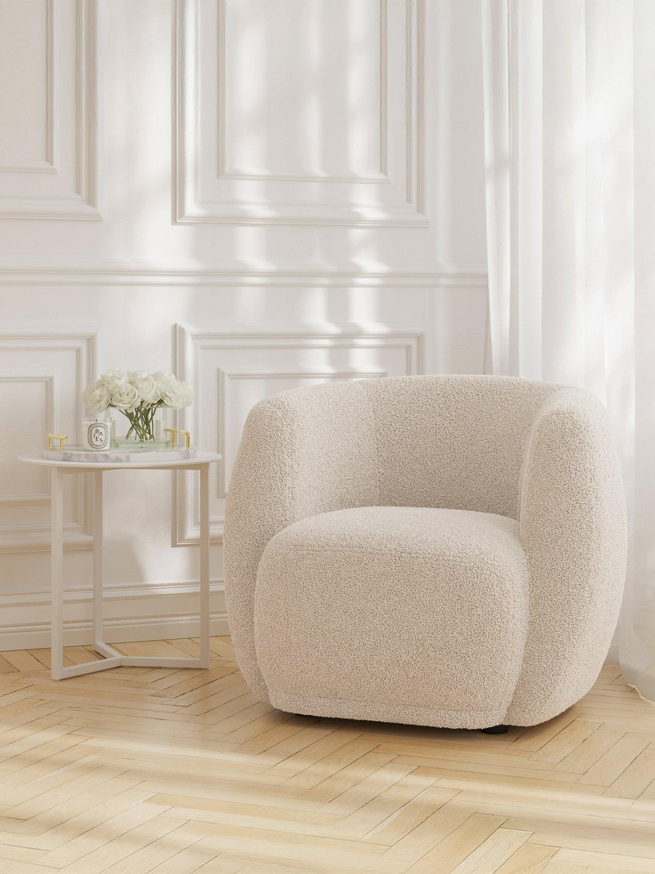 The Clay Cotton Chair showcases soft sherpa fabric in a trending colour, offering a cosy tub chair design with a wide, comfortable seat-perfect as an inviting snuggle chair for any space.