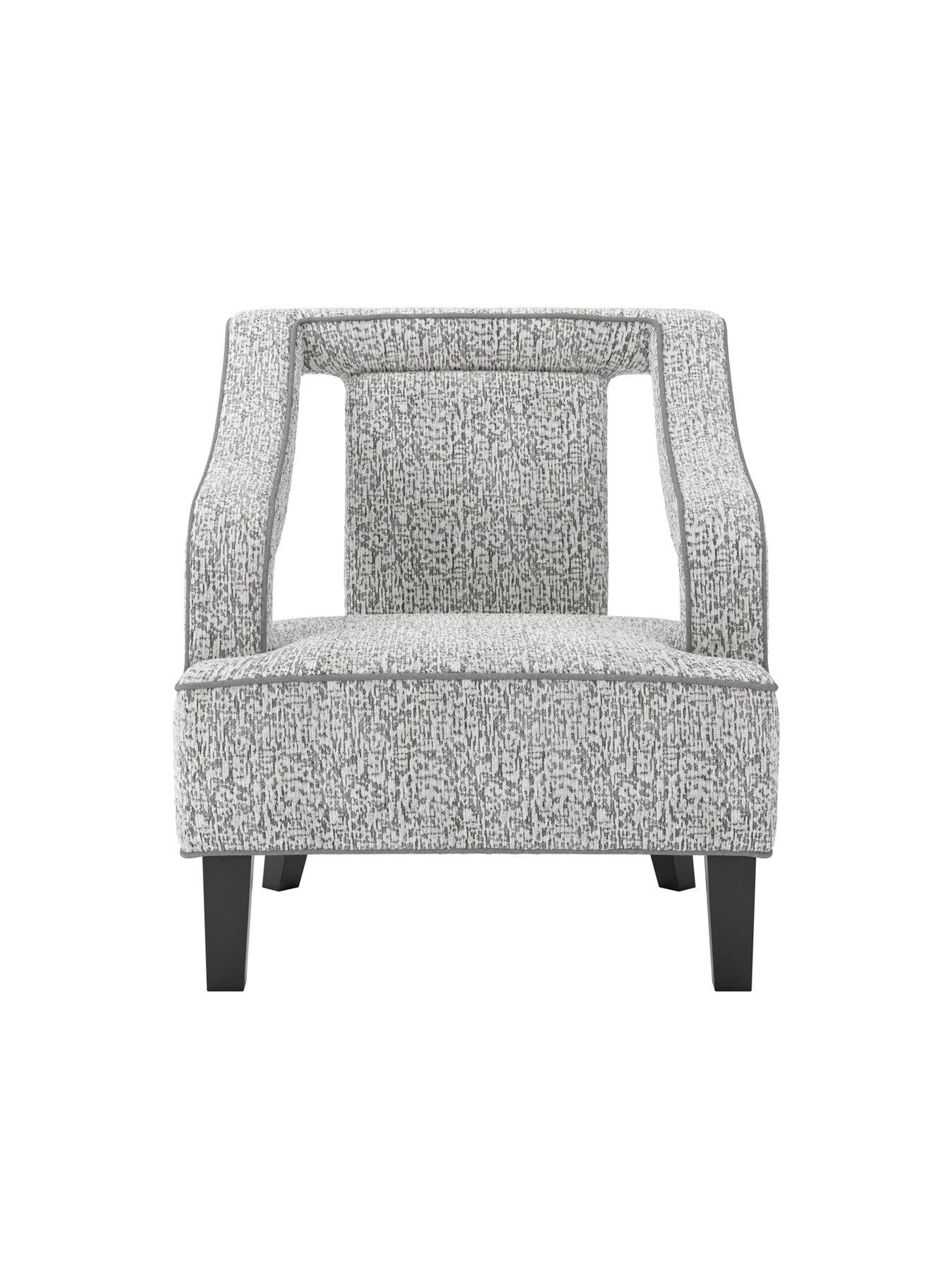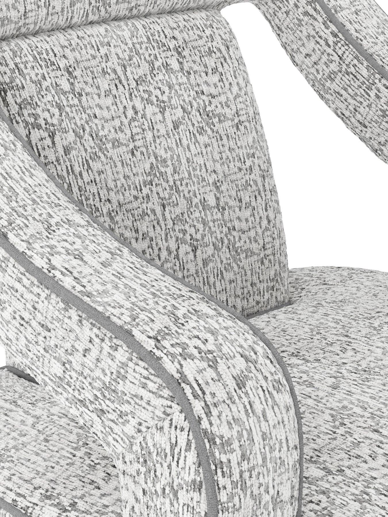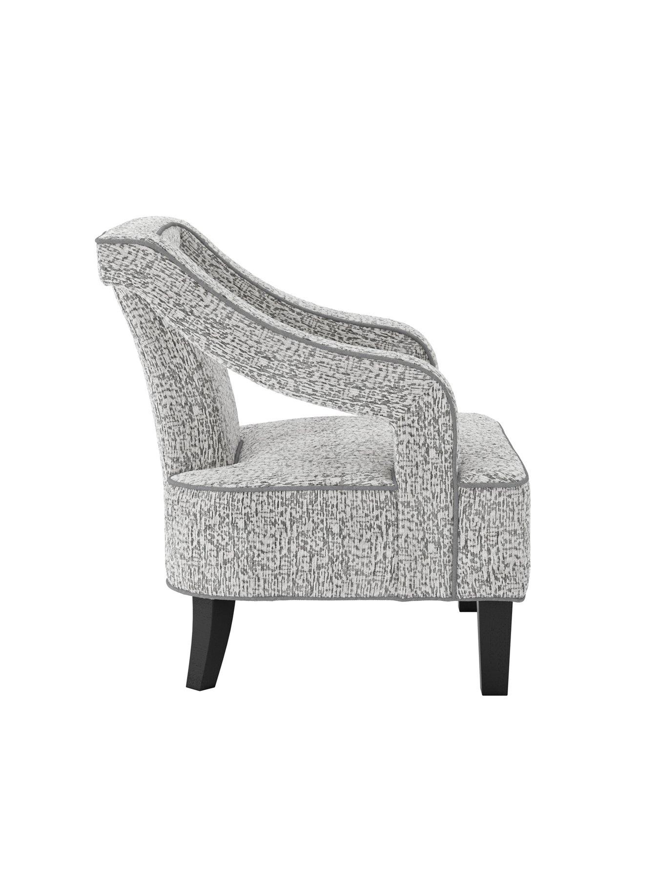 The Sofia chair pairs its textured Elephant upholstery with contrast piping in a refined design. Its wide, plush armchair silhouette sits atop sleek matte black legs, blending comfort and sophistication.