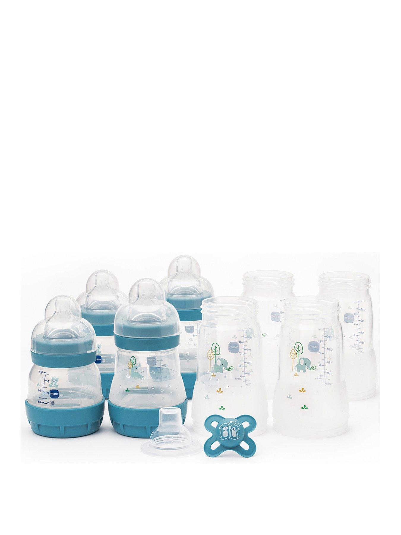 MAM Easy Start Feeding Bottle Set Small- BlueIntroducing MAM's iconic Easy Start Anti-Colic Bottles. Contains 2x 130ml bottles including extra slow flow no. 0 teats, 2x 160ml bottles including slow flow no. 1 teats, 4x 260ml bottle bodies, 1x 0-2 month Start soother, 1x extra soft bottle spout & 1x hold my bottle handles.Created with parents and babies alike at the forefront of MAM's mind. As your little one grows and requires a greater volume of milk, the progression in bottle sizes make for a seamless transition throughout your babies feeding journey, and the inclusion of the start soother is comfortable and easily accepted by babies. This set has thought of it all! Simple and safe to use and with the aim of making everyday baby life easier, MAM's Easy Start Bottle's Set includes the SkinSoftTM teat which is silky soft and provides a familiar feel for babies. Market research confirms that 94%* of babies accept the teat making it perfect for when mum wants to be a bit more flexible. One of the biggest features parents love about the Easy Start Anti Colic Bottles are their ability to self-sterilise. With no need for a separate bottle steriliser, MAM bottles can be self-sterilised in 3 easy steps, ensuring simple and safe bottle cleaning without hassle. MAM's anti-colic bottles also provide a smooth drinking flow by preventing the formation of air bubbles, reducing colic symptoms in 80%** of babies who use them. (*Market research 2009-2022, tested with 1,643 babies.) (**Consumer study USA 2010, tested with 131 mothers, Medical study of 73 infants with colic symptoms, Austria 2011)