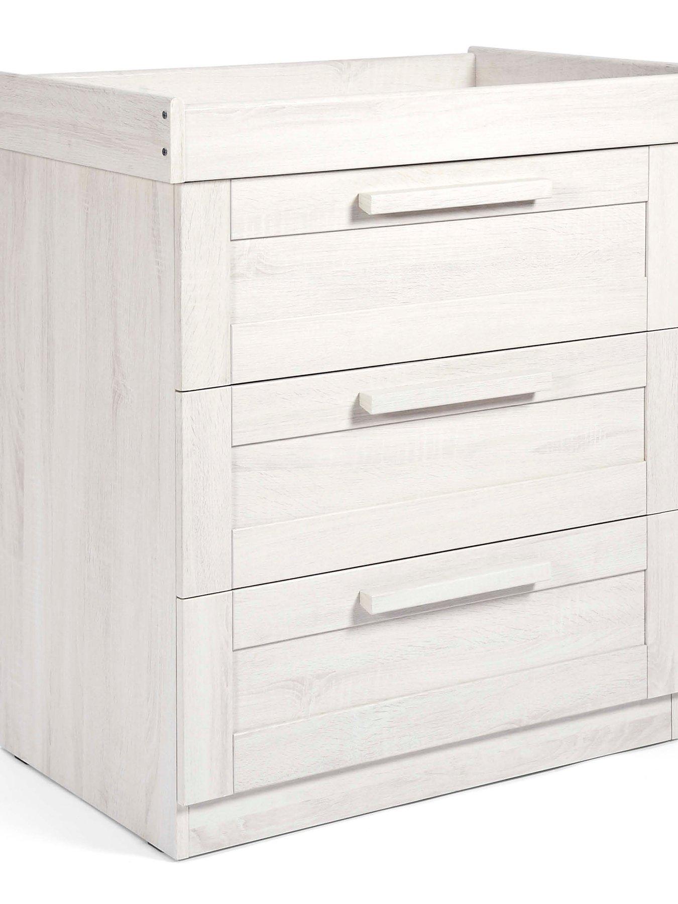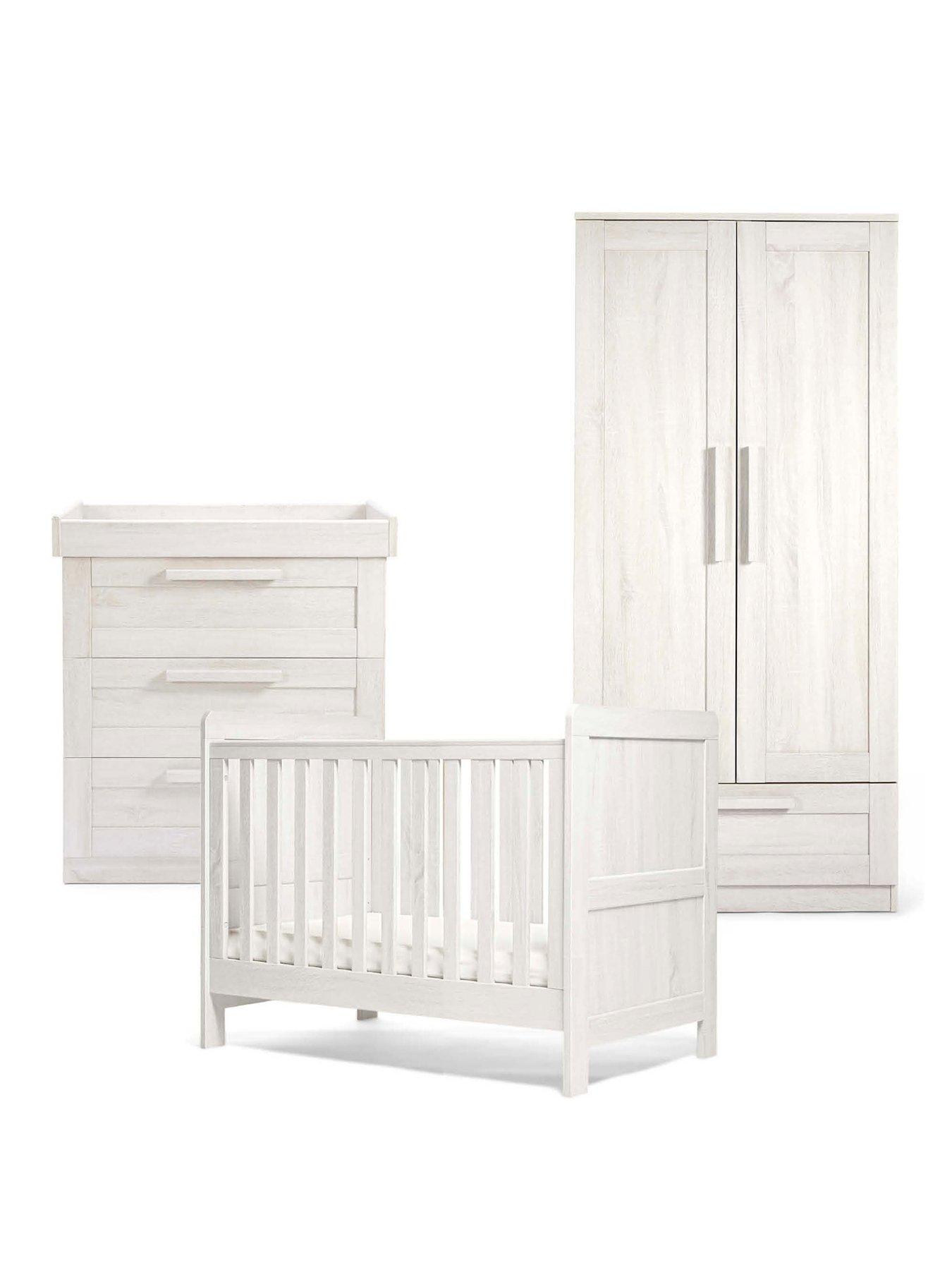 Mamas & Papas Atlas Convertible Cot Range (Convertible Cot, Dresser & Wardrobe) - WhiteThe Atlas small cotbed range is a timeless three-piece nursery set designed to maximise smaller spaces without sacrificing style or comfort. The small cotbed is carefully designed to fit more compact nursery layouts while providing your little one with a roomy and comfortable sleep space. As your child grows, the small cotbed easily converts into a toddler bed, offering restful sleep until they reach four years old. Combined with the Atlas wardrobe and dresser, this woodgrain finish set creates a cohesive, classic feel for any nursery. Plus, its adjustable features and ample storage ensure you won't need to replace furniture as your little one grows. Don't forget your mattress: This is designed for use with any Mamas & Papas mattress measuring 120 x 60 x 10cm. Dimensions: Cot Bed: Cot Mode 125 x 68.2 x 95.6cm, Bed Mode 125 x 68.2 x 61.7cm. Dresser Changer: With Changer Rails Fitted: 89.4 x 57 x 95.4cm, Without Changer Rails Fitted: 85 x 55.5 x 86.8cm. Wardrobe: 84.3 x 56 x 182cm.