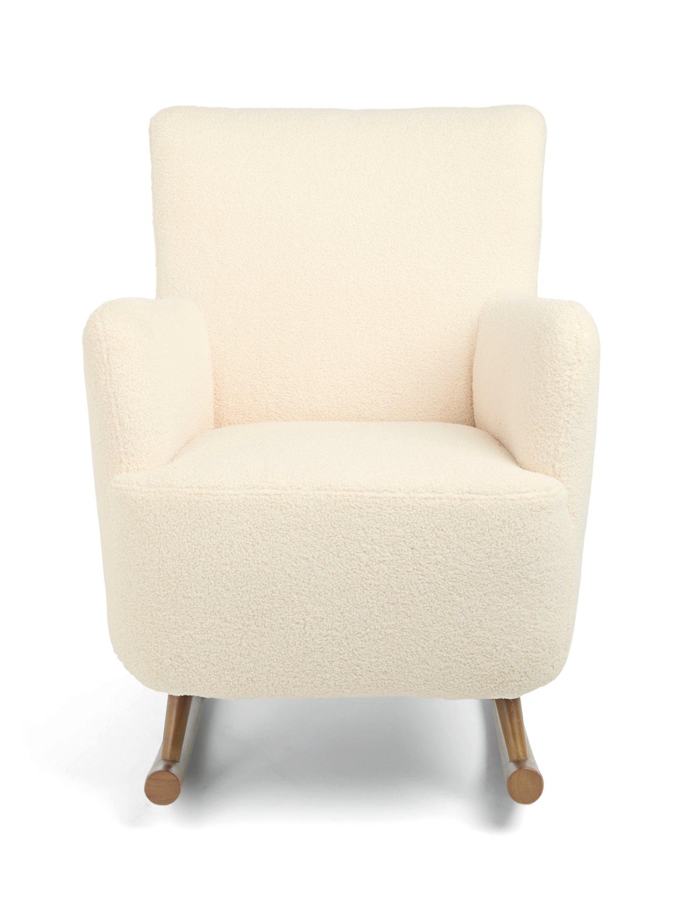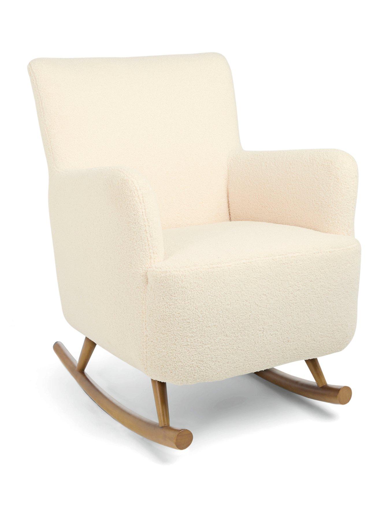 Mamas & Papas Elwood Nursing Chair Off WhiteDesigned in-house at Mamas & Papas to comfort and support you and your little one, the Elwood nursing chair brings both style and practicality. Its high, wingback design and optimum-height cushioned armrests mean you're perfectly supported for every feed, cuddle and cosy moment, day and night. A deep, cloud-like seat and gentle rocking motion enhance Elwood's appeal, creating a cosy haven that's stylish as it is soothing. Plus, this modern boucle nursing chair and stool will look equally at home in rooms beyond the nursery post-baby stage.