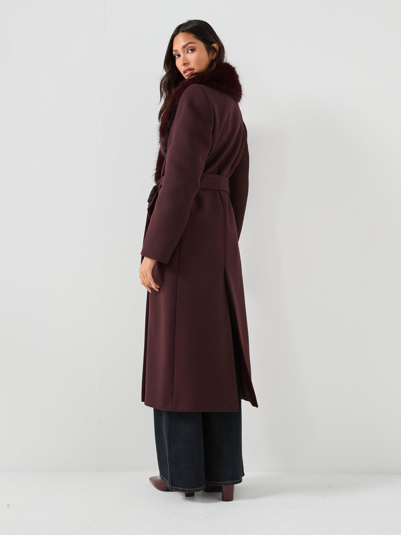 • Crafted from Italian Manteco wool fabric, this long, straight design features a V-neck with notched lapels. It has a detachable fur-effect collar, long sleeves and a robe-style belt.