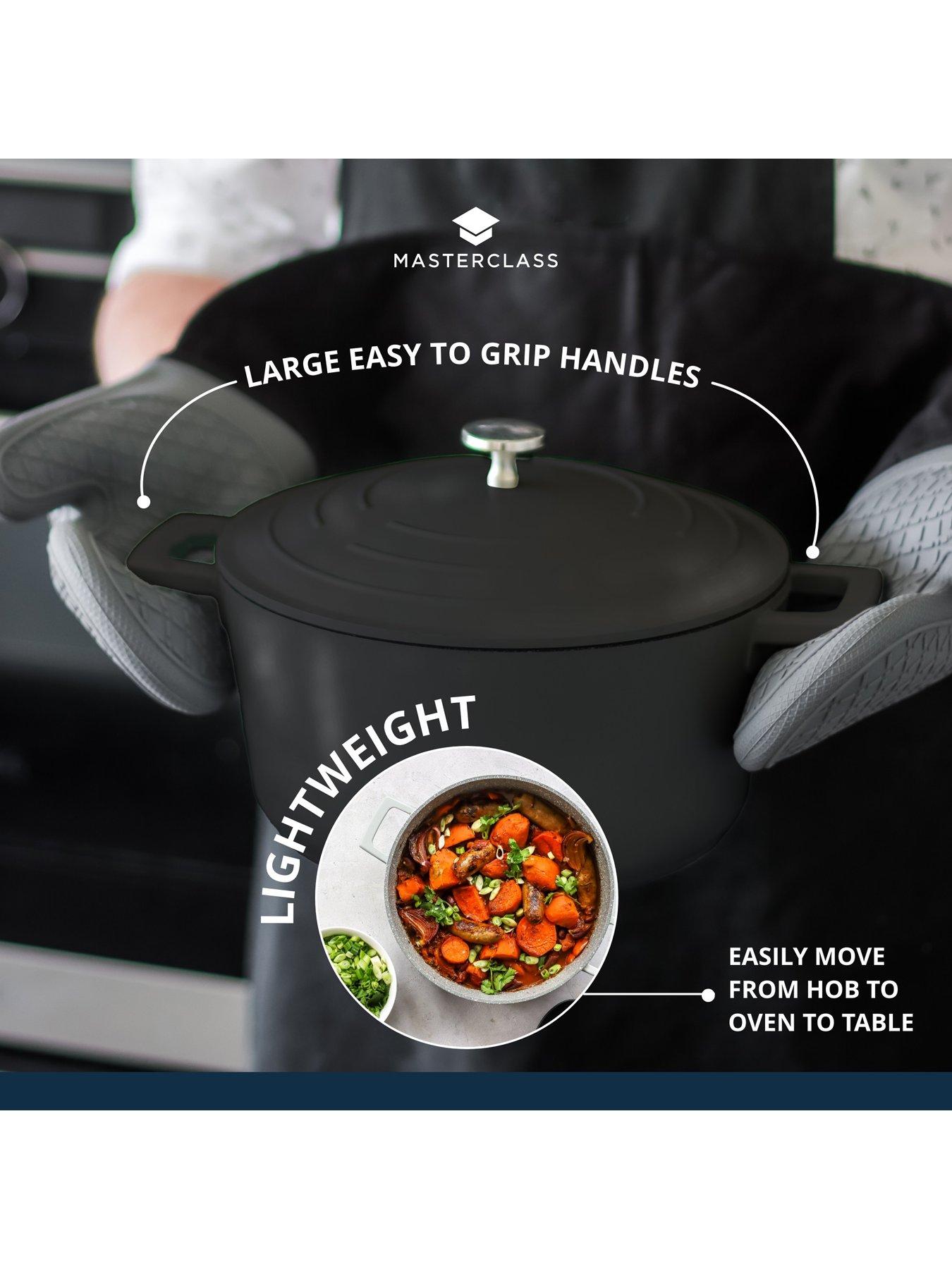 MasterClass Lightweight Cast Aluminium 2.5 Litre Casserole Dish - BlackWhether slow-cooking a delicious dish in the oven or creating a hearty favourite on the hob, this 2.5-litre cast aluminium casserole dish from MasterClass is built for high-performance meal-making.With a 28 cm diameter, the cast aluminium construction is incredibly strong and sturdy, as well as being a fantastic heat conductor. A stainless steel base allows you to use the pan on any hob, including induction, and it’s also oven safe to 200°C/392°F/Gas Mark 6. This means it’s ideal for whipping up a family-filling casserole or even making fresh, crusty bread. The self-basting lid also helps to keep moisture in the pan while cooking, so you don’t need to worry about delicious joints of meat or baked chicken thighs drying out as they cook. Classic in black, the exterior is finished with an incredibly tough double scratch-proof layer, while the coordinating interior has non-stick properties, so you can cook with little to no oil, and the washing up is easier too!