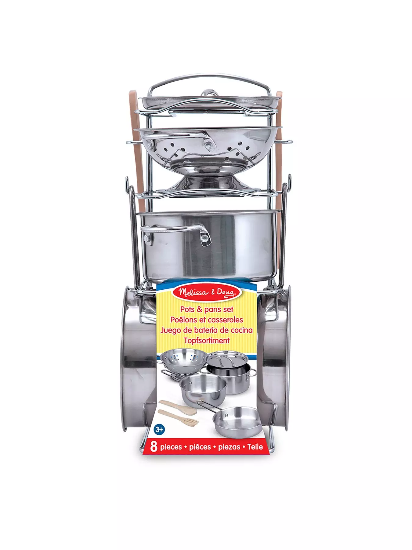 This play set features shiny stainless steel cookware Mum and Dad would envy!Generously sized for a more realistic look and feel, the colander and three pans (with interchangeable lid) fit most play food items for exciting restaurant and kitchen play . . . and store neatly on a convenient storage rack when the kitchen is closed.