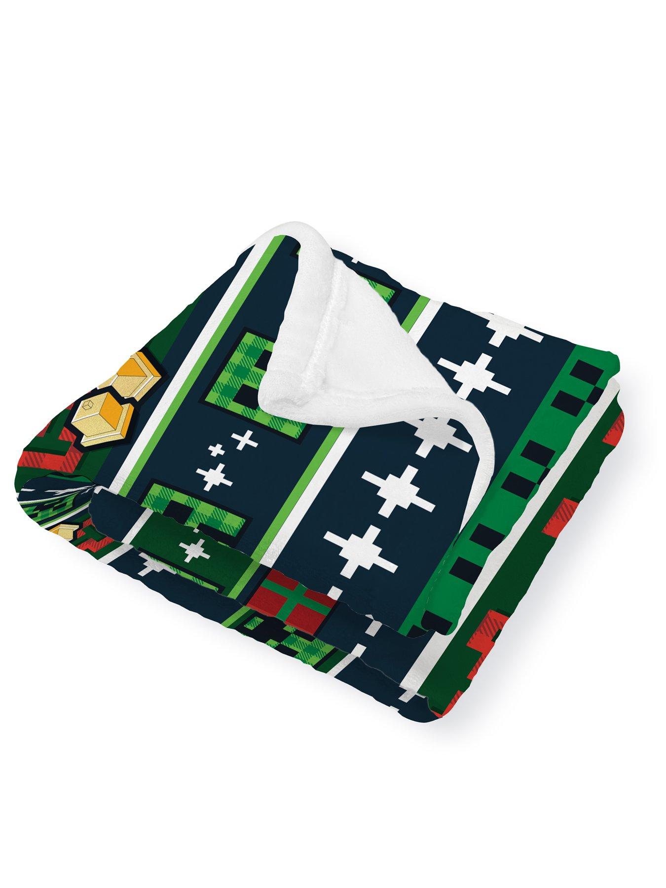 Minecraft Christmas Sherpa Backed FleeceGreat as a gift at Christmas or in the run up to the holidays, this officially licensed Minecraft sherpa backed fleece blanket is perfect for the Minecraft fan or gamer in your life. Inspired by the holidays and traditional Christmas jumpers, this sherpa fleece blanket features Minecraft Creepers, jingle bells, Christmas presents, and snow in the iconic blocky Minecraft style. This officially licensed Sherpa lined fleece blanket is fantastic for wrapping up warm during the cold winter months! Great all around the house, either as an extra layer in bed, lazing on the couch watching a film on family movie night, keeping yourself comfortable when gaming in a chair, or keeping warm while doing homework.The fleece has an extra warming Sherpa layer but is lightweight and folds up to a compact size, making it great for car journeys, travel, and holidays, whenever you need to wrap up warm. This large fleece blanket measures 100 x 150cm, plenty big enough to keep you covered up, or act as a throw at the end of a bed. Made from soft strokable textured polyester, this fleece blanket is machine washable, so it's easy to throw in to a wash to freshen up if there's any spills or accidents, and tumble dryer safe to quickly dry ready to be used again.