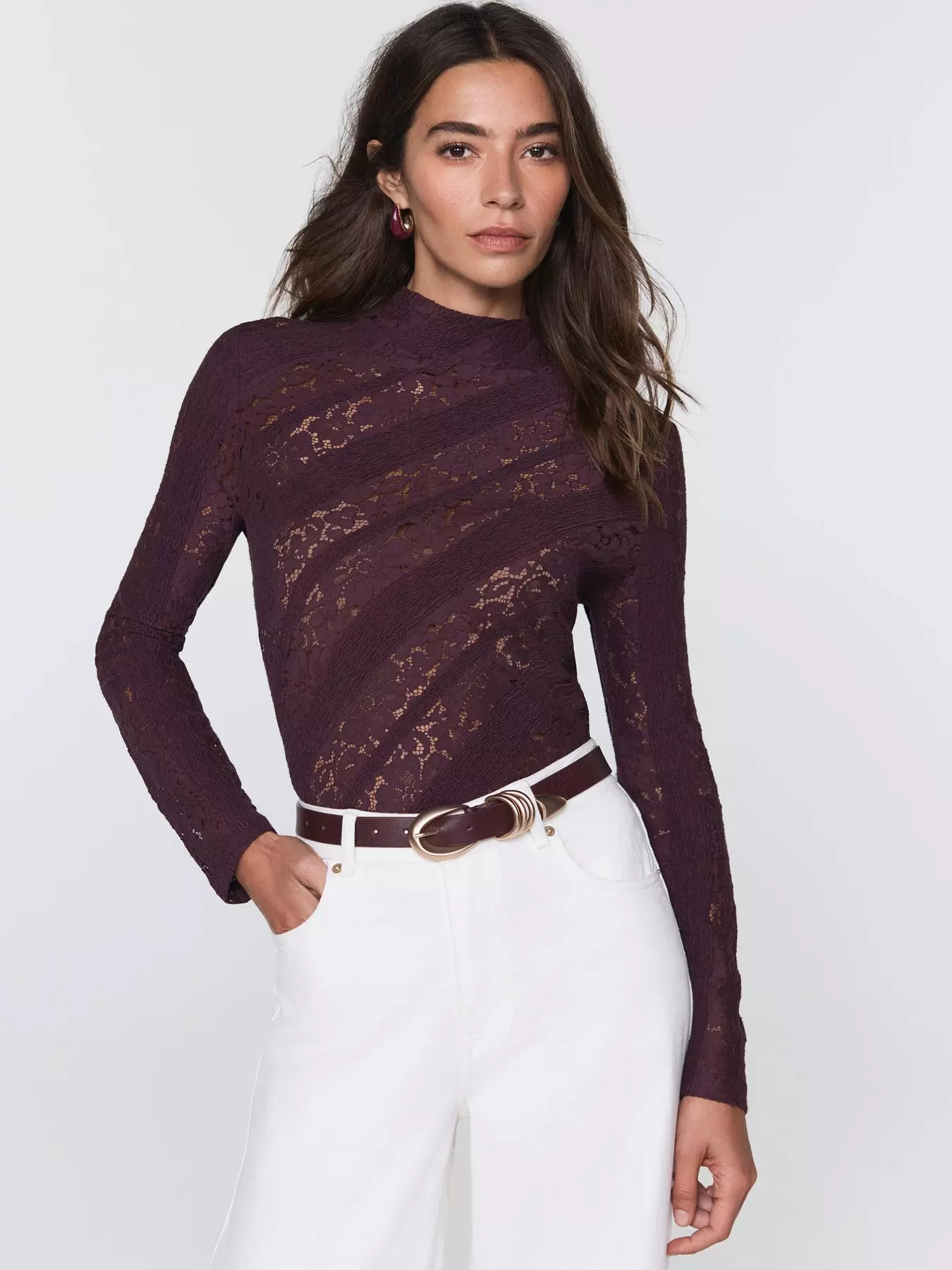 Burgundy lace top featuring a high neckline, crinkle panelling, long sleeves and a button fastening through the back.- Material Content: Main, 55% cotton, 1% elastane, 44% polyamide