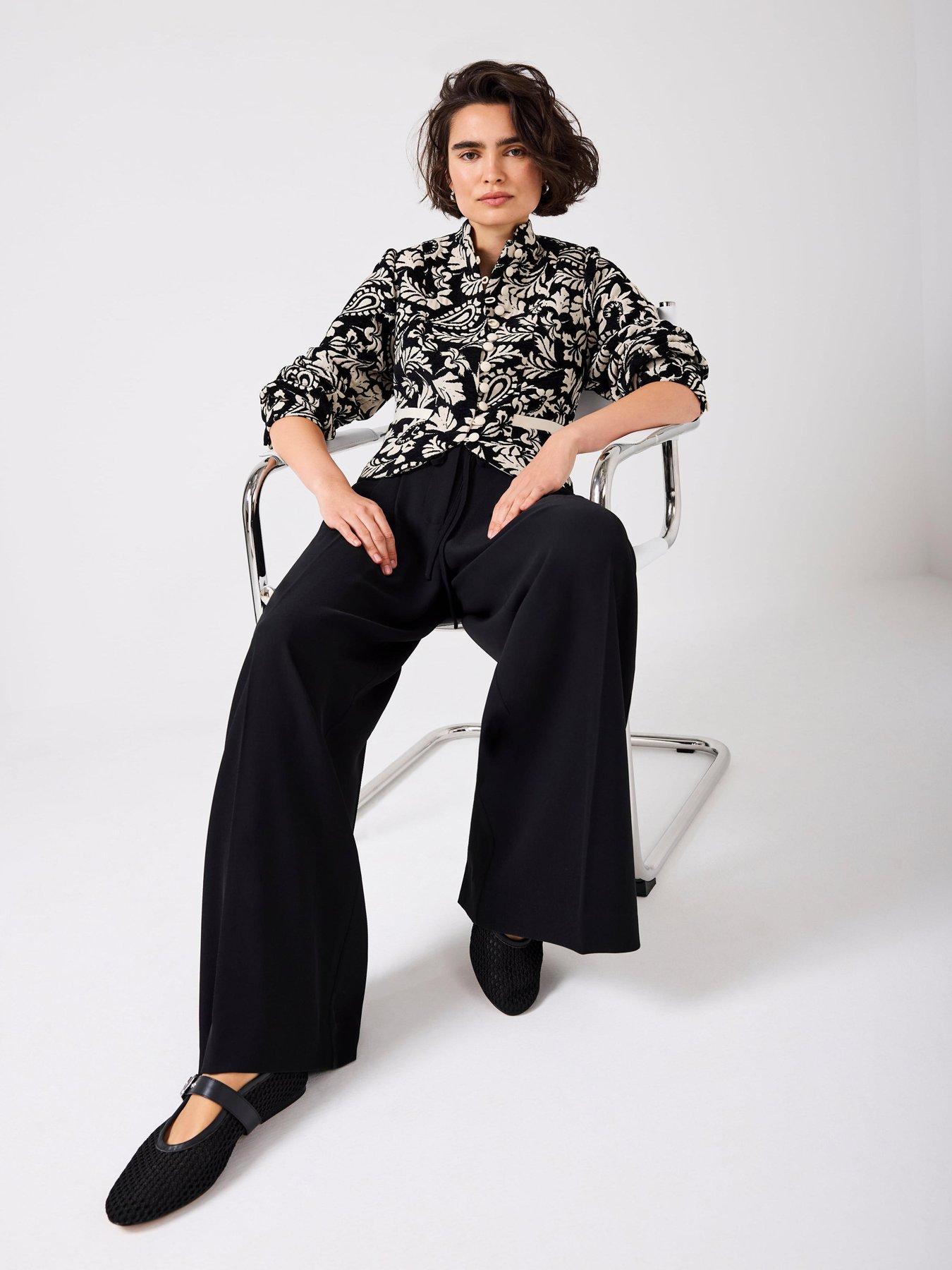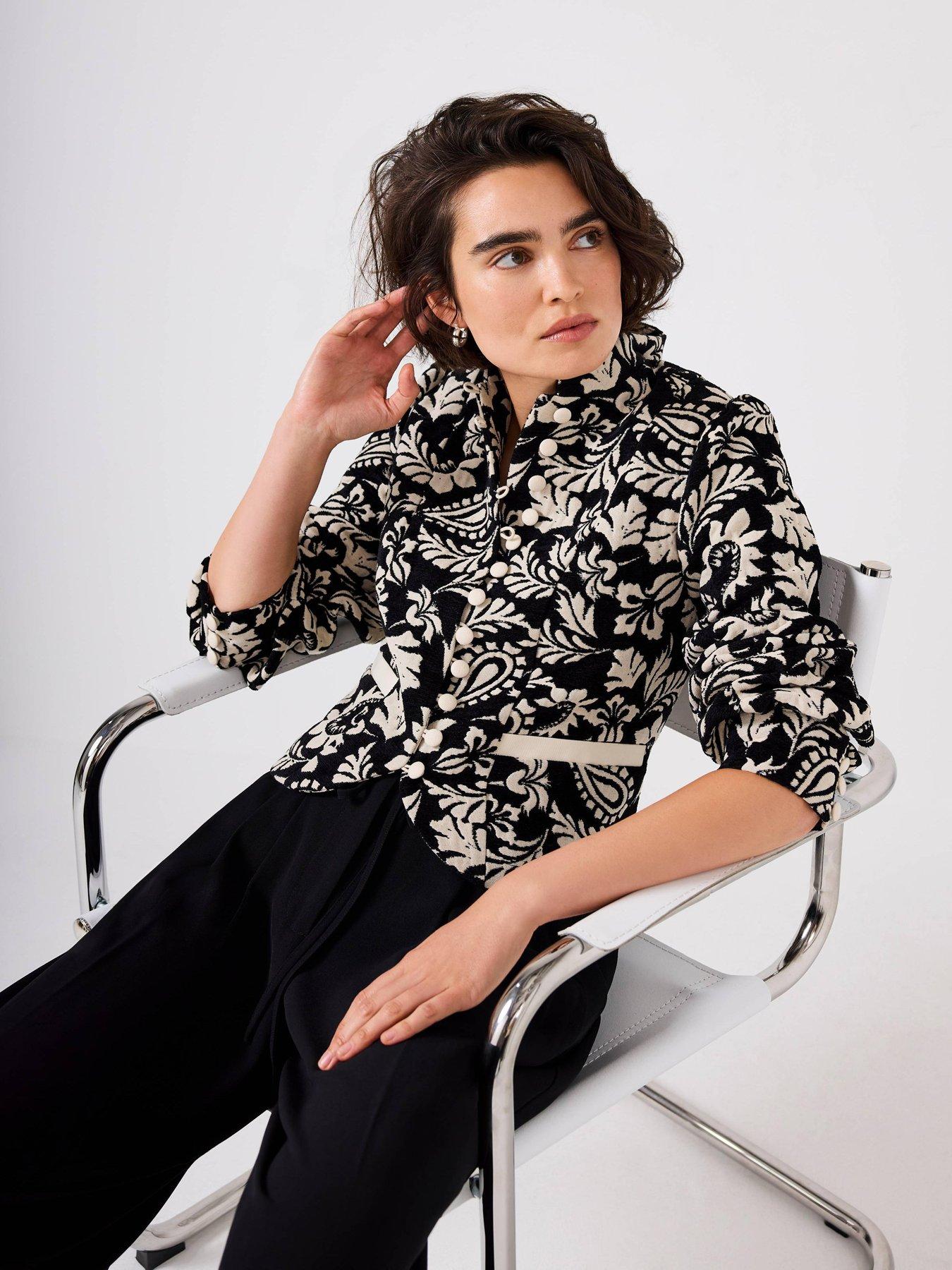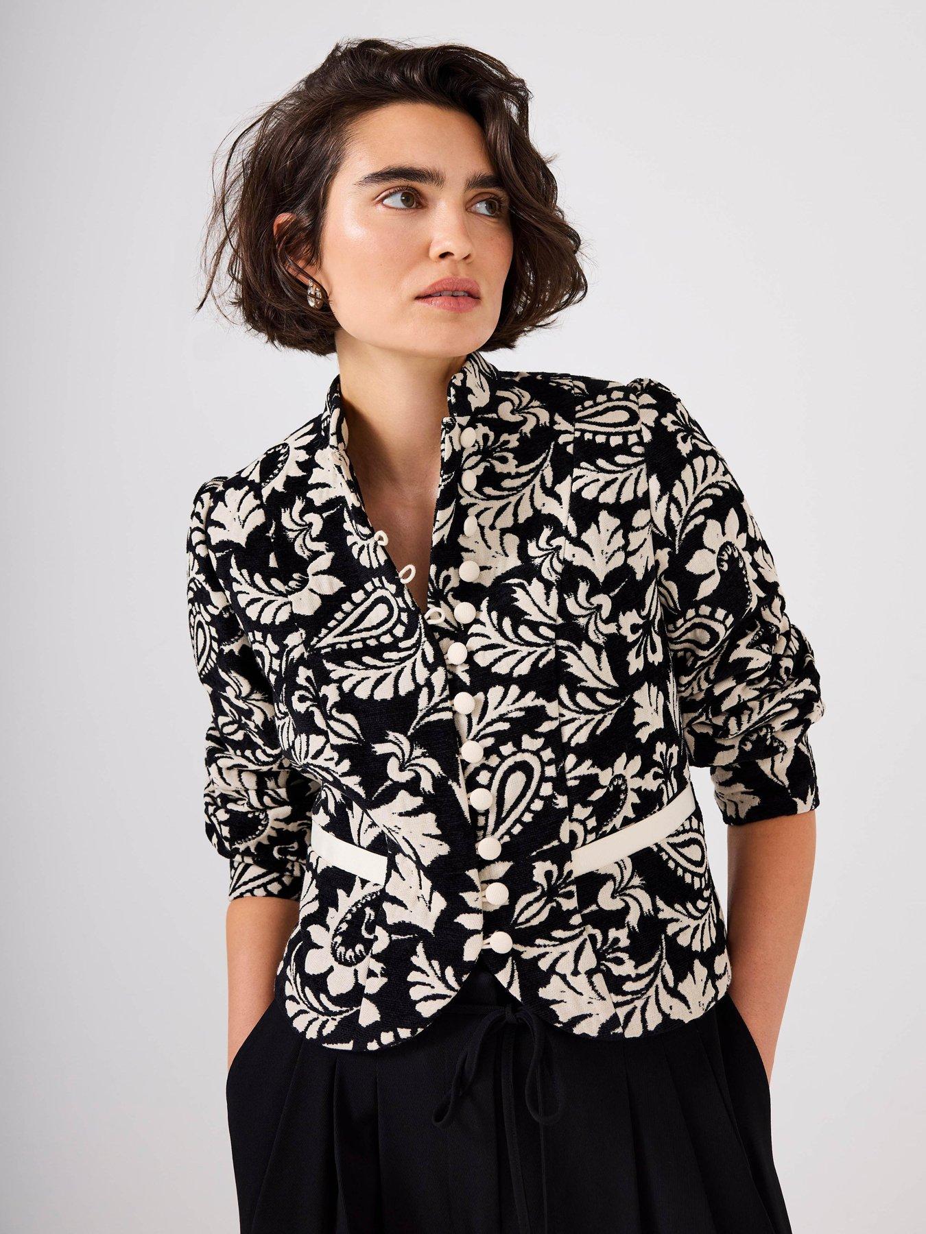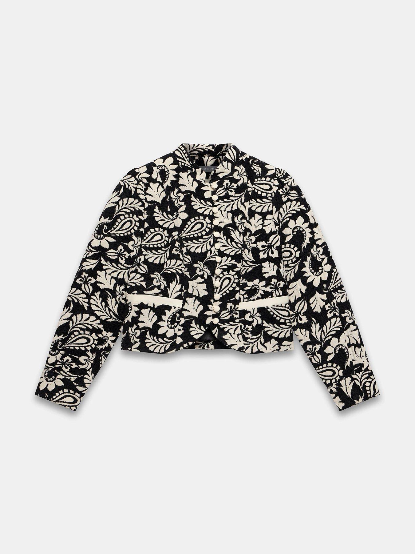 Mint Velvet Jacquard Poets JacketBlack jacquard paisley jacket in a cropped silhouette featuring a high collar, welt pockets, long sleeves, buttoned cuffs with a button fastening through the front.