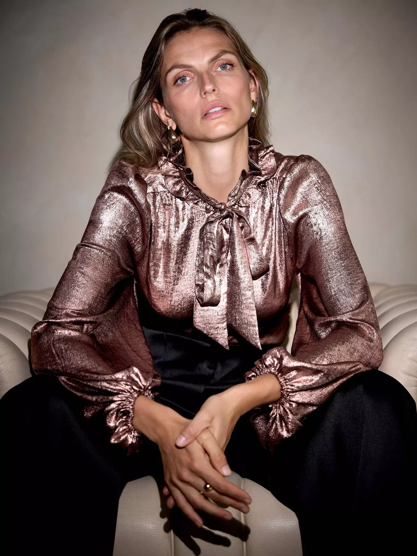 Pink metallic blouse featuring a high ruffle self-tie neckline, long sleeves, elasticated cuffs, scooped hemline, with a concealed button fastening through the front.- Material Content: Main, 100% polyester