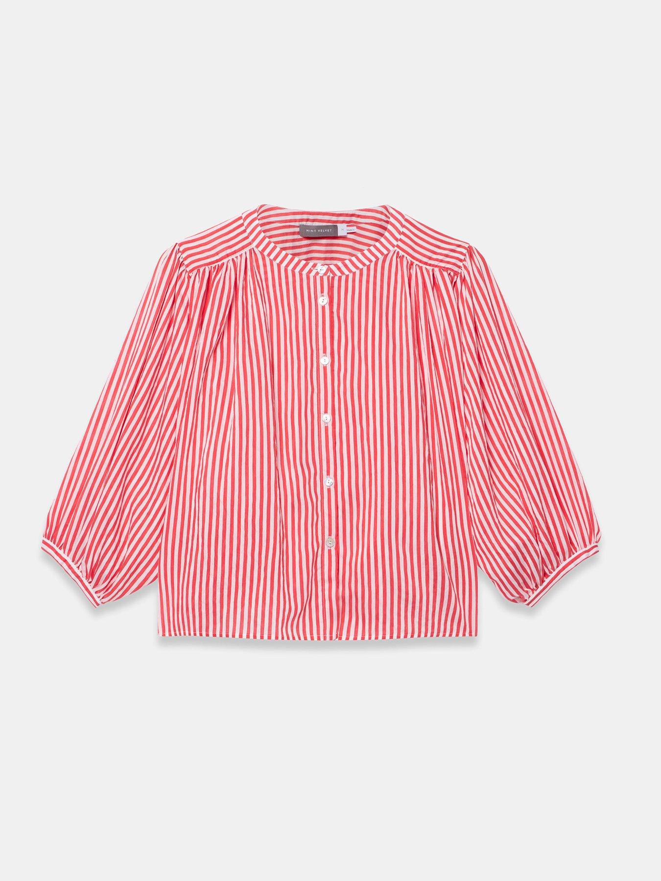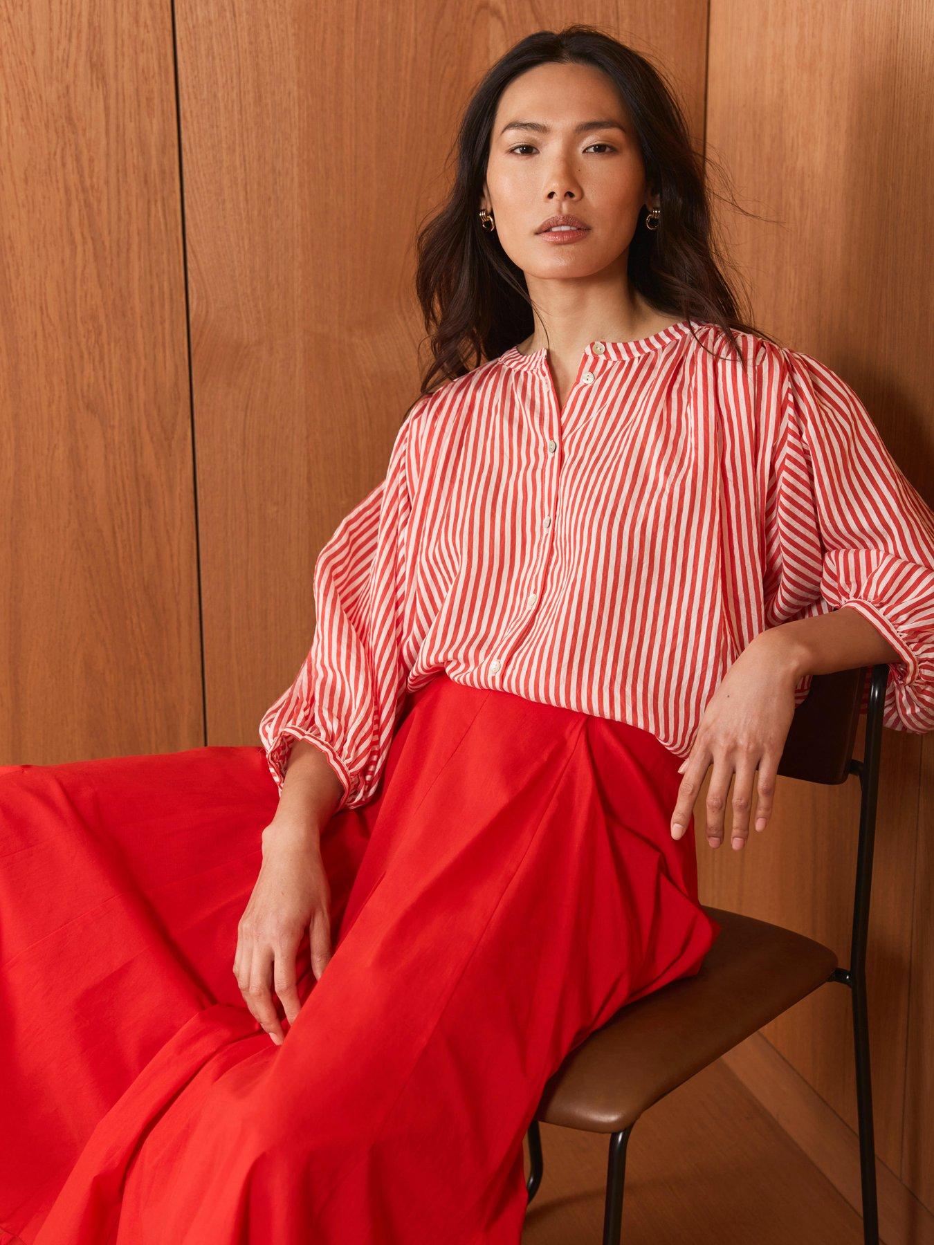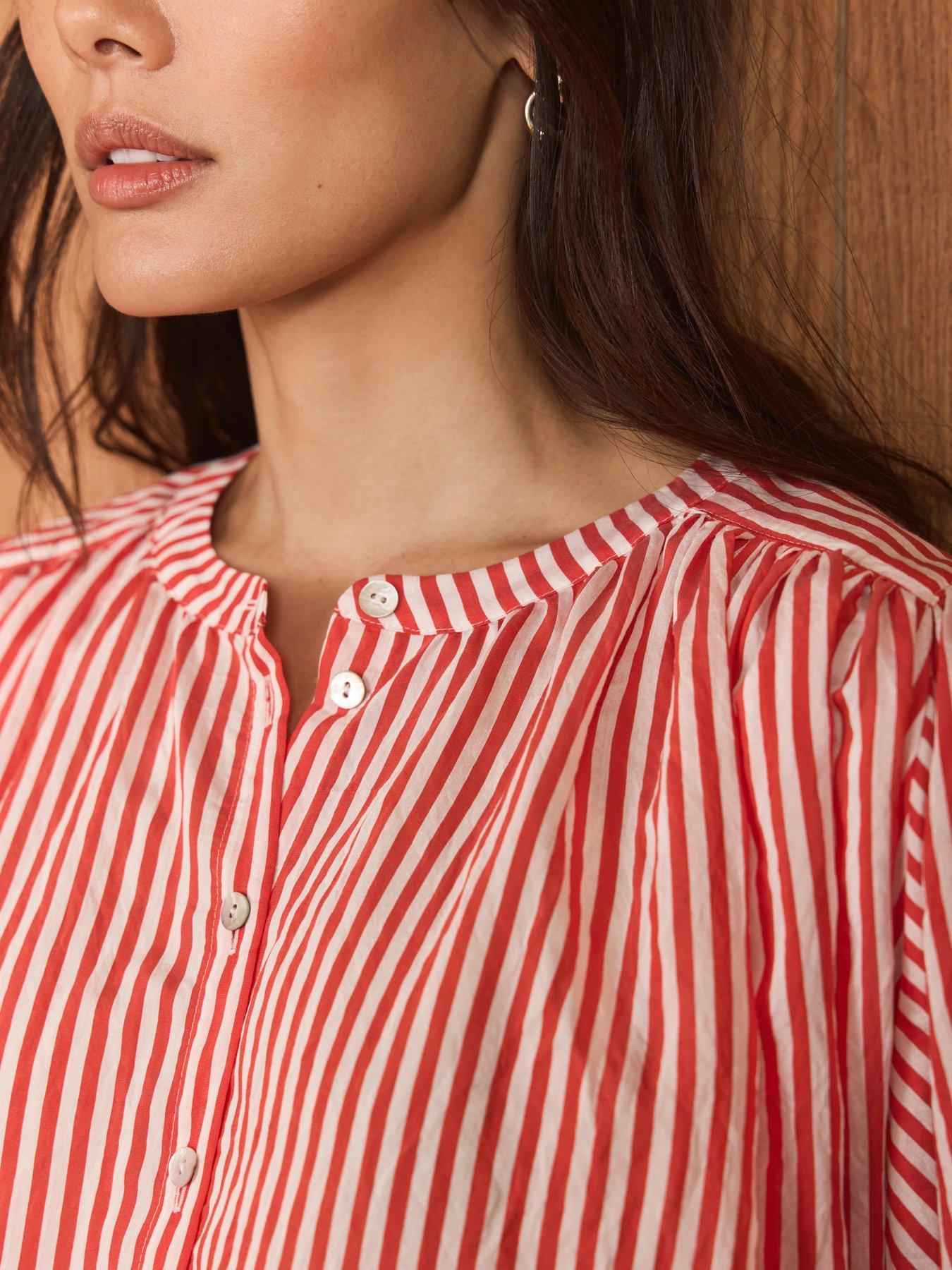 Mint Velvet Red Stripe Batwing BlouseRed striped gathered blouse featuring a crew neckline, 3/4 length buttoned sleeves with a button fastening through the front.
