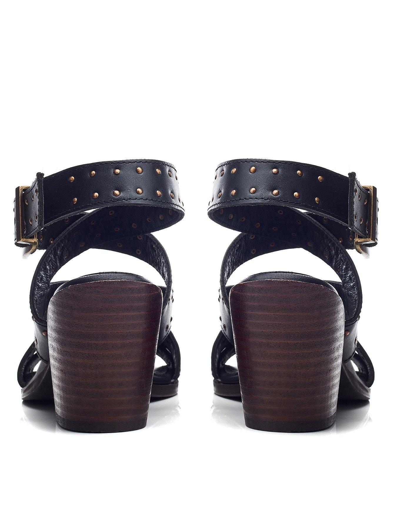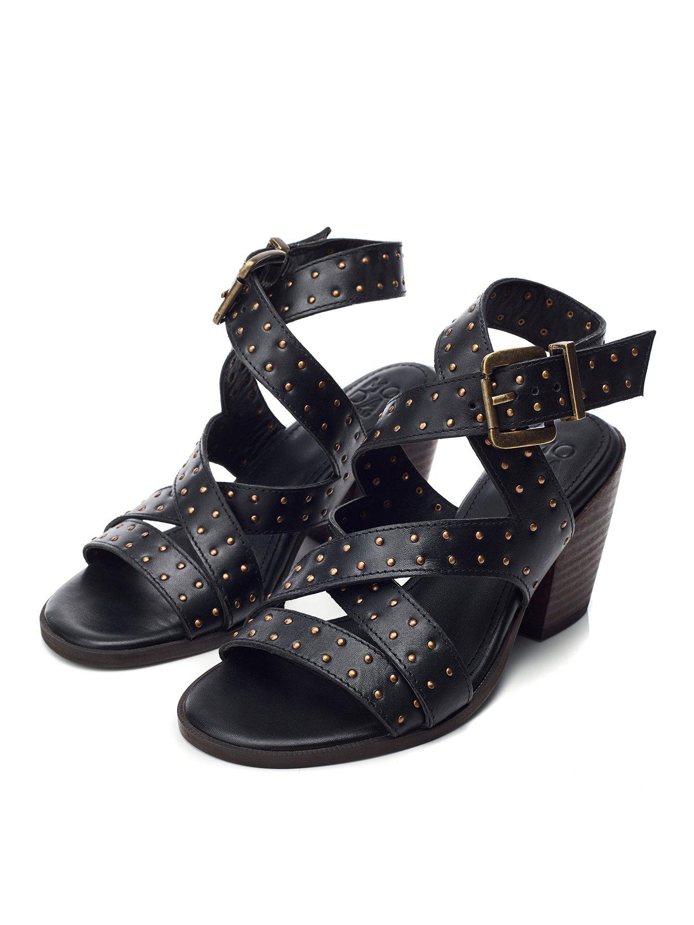 Moda In Pelle Mayley Stud Western Heeled Sandal - BlackMake a statement in Mayley, the asymmetrical strap sandal featuring studded detailing and a stacked Cuban heel. Designed with a nod to the popular Western trend, this unique sandal is a must have for the fashion forward.