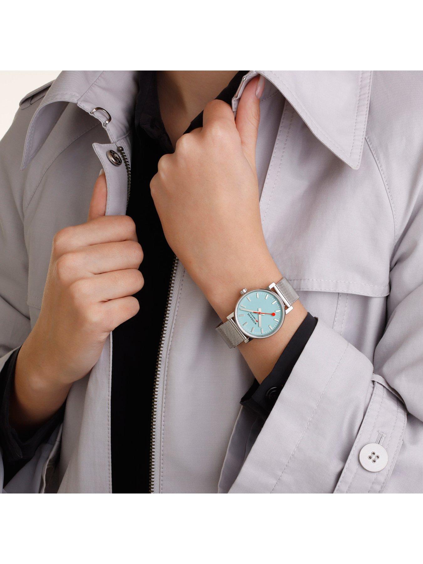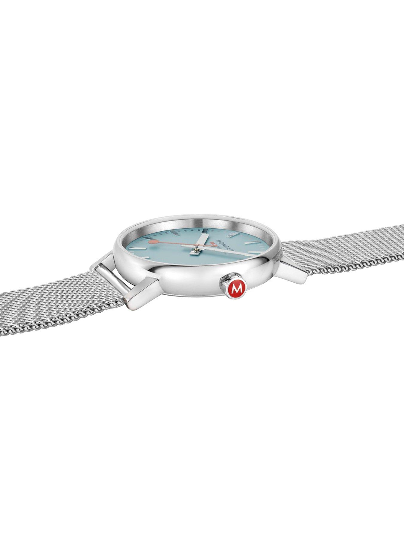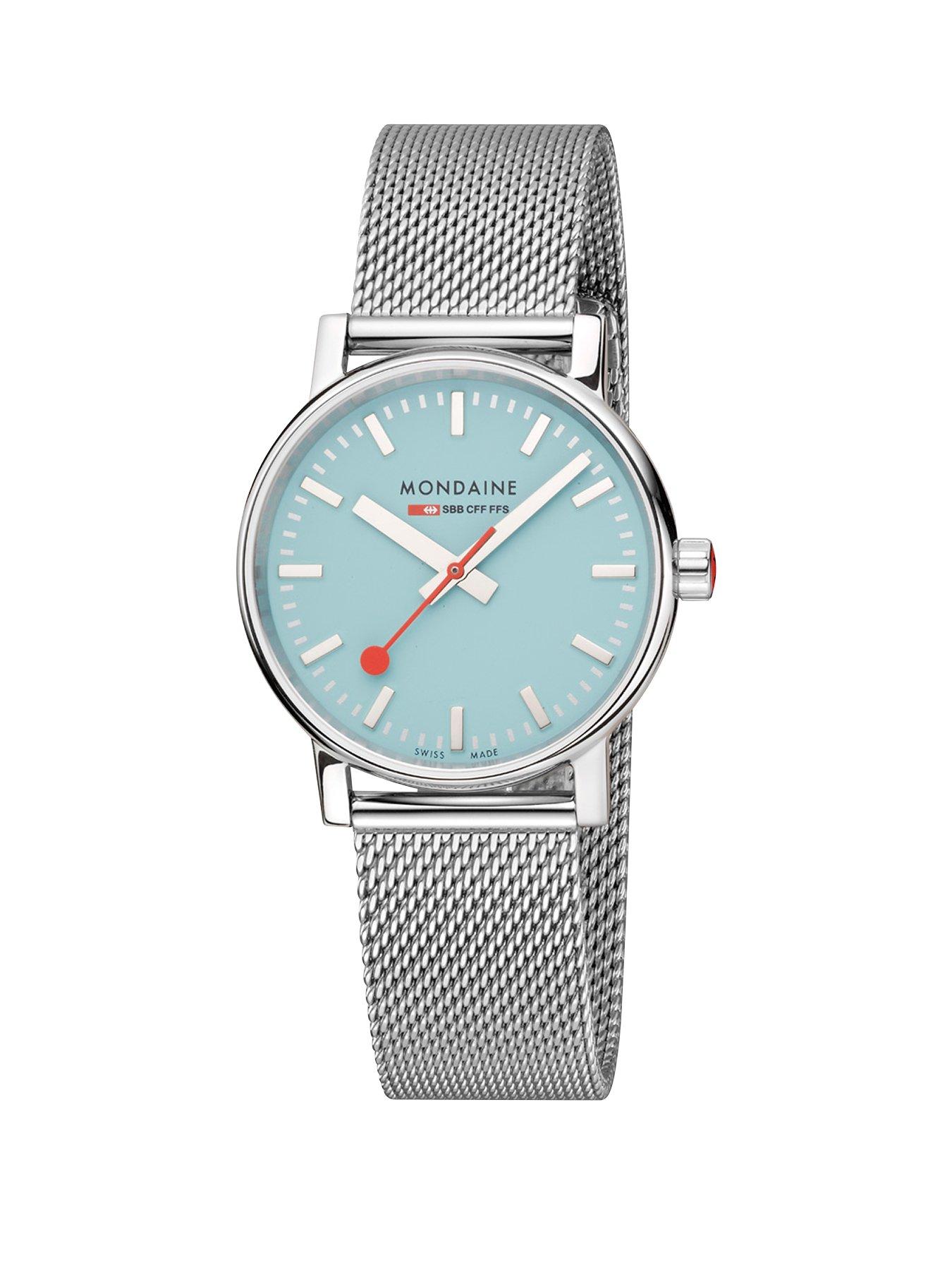 Mondaine evo2 Unisex WatchThis seasonal watch color of the evo2 is deeply rooted in nature. The watch features a 35mm diameter polished stainless steel case and a Turquoise Lake dial inspired by the crystal clear blue waters of the Swiss lakes, a true national treasure and awe-inspiring spectacle. The Turquoise Lake dial evokes the power and magic of Mother Nature, bringing a touch of freshness and emotional well-being to your wrist day after day.
