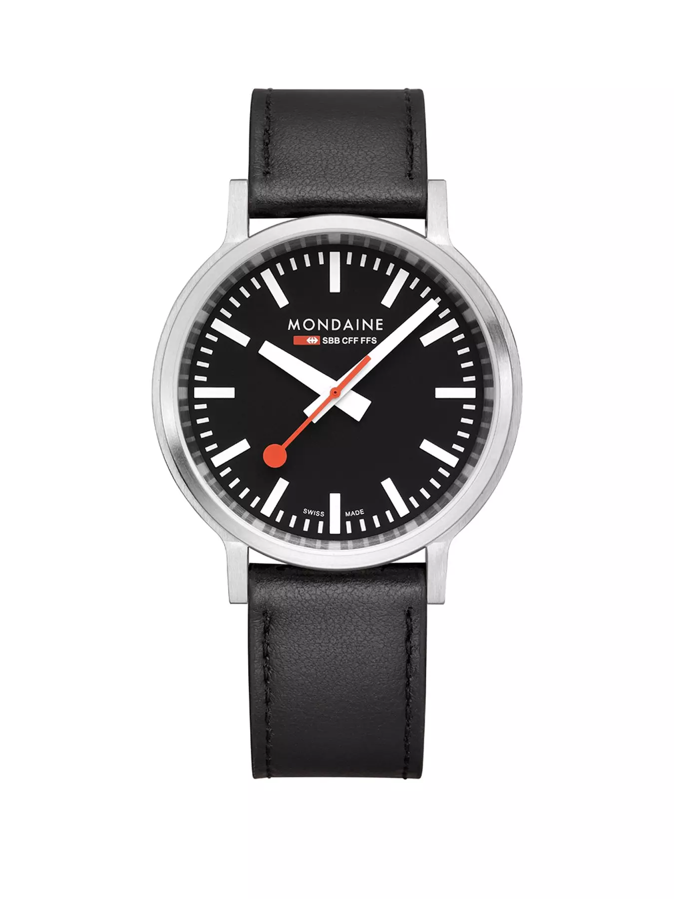 With its strikingly robust design featuring a crown-less case, the stop2go watch encapsulates the true essence of the iconic Swiss Railways station clock. The black dial and 41 mm brushed stainless steel case are paired with a black vegan grape leather strap. Equipped with the exclusive and unique Swiss-Made stop2go movement resembling that of the Swiss Railways clock it showcases a 2-second time stop. The watch also features SuperLuminova that allows the time to be read in darkness. The watch comes with a time setting pen to easily adjust time and align hands.- 24Hr Display: N