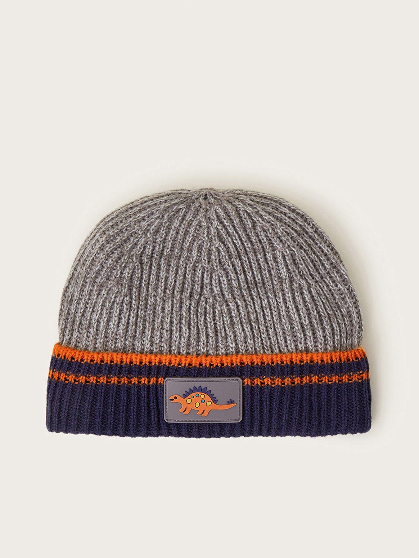 Monsoon Boys Dino Badge Knitted Hat - GreyHear me ROAR! With a rubber dinosaur badge to the turned-up brim, this beanie hat is finished in a stripe ribbed knit for an extra cosy fit.
