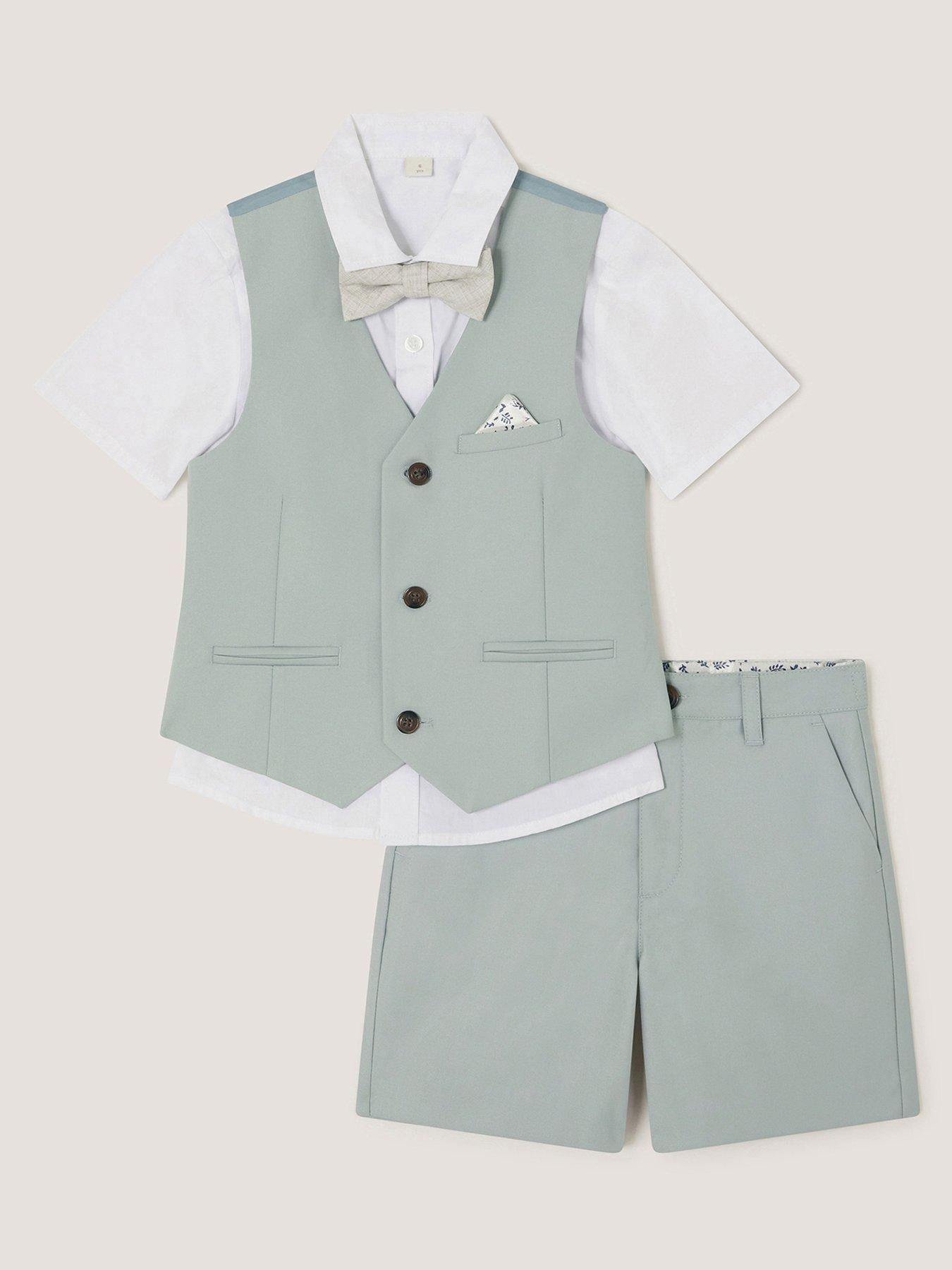 Monsoon Boys Finn 4 Piece Smart Short Set - Light GreenSummer wedding, you say? Featuring tailored shorts and a matching waistcoat in subtle sage, this set will keep them looking (and feeling) fresh. Complete with a crisp short sleeve shirt and bow tie.