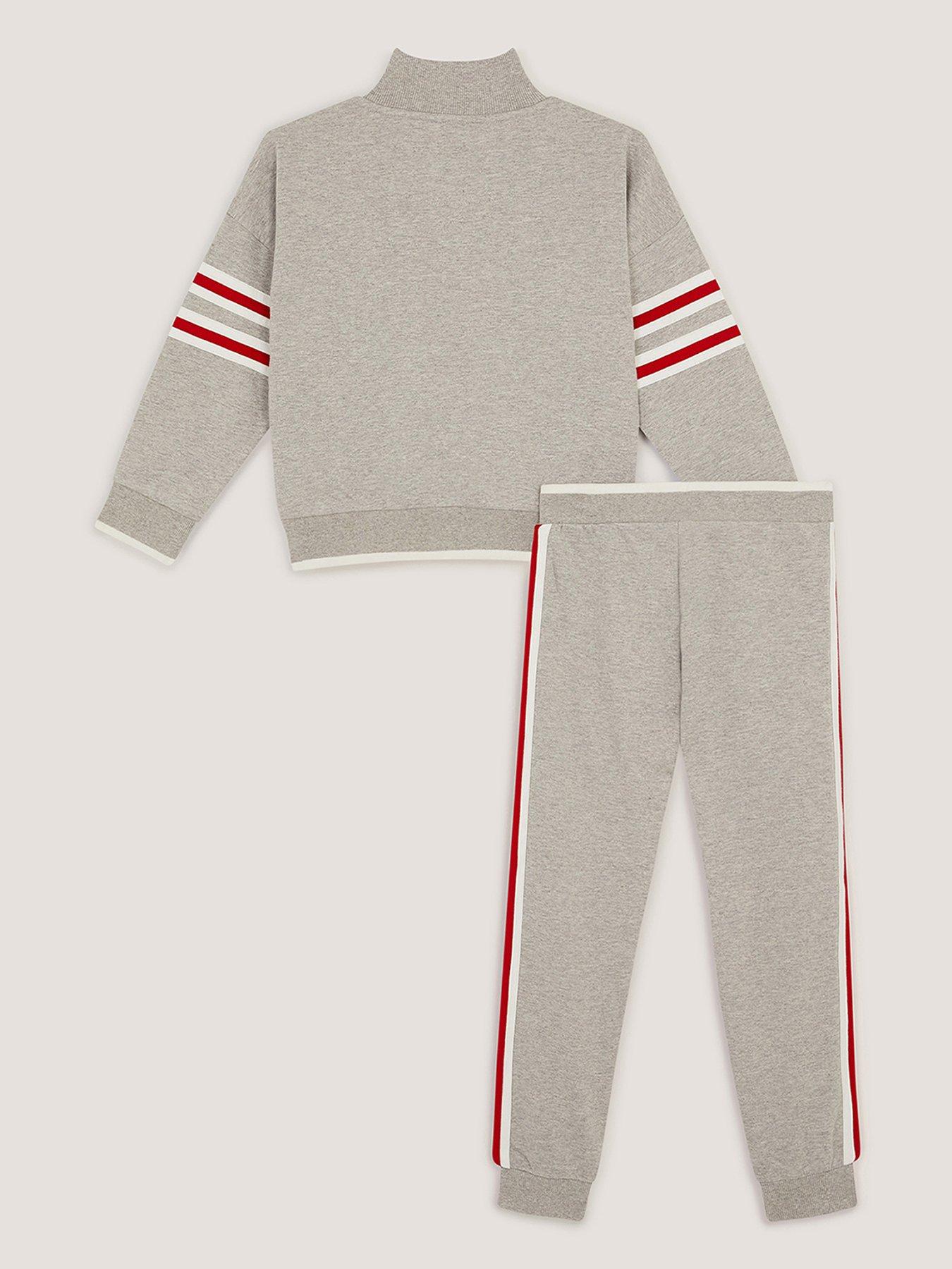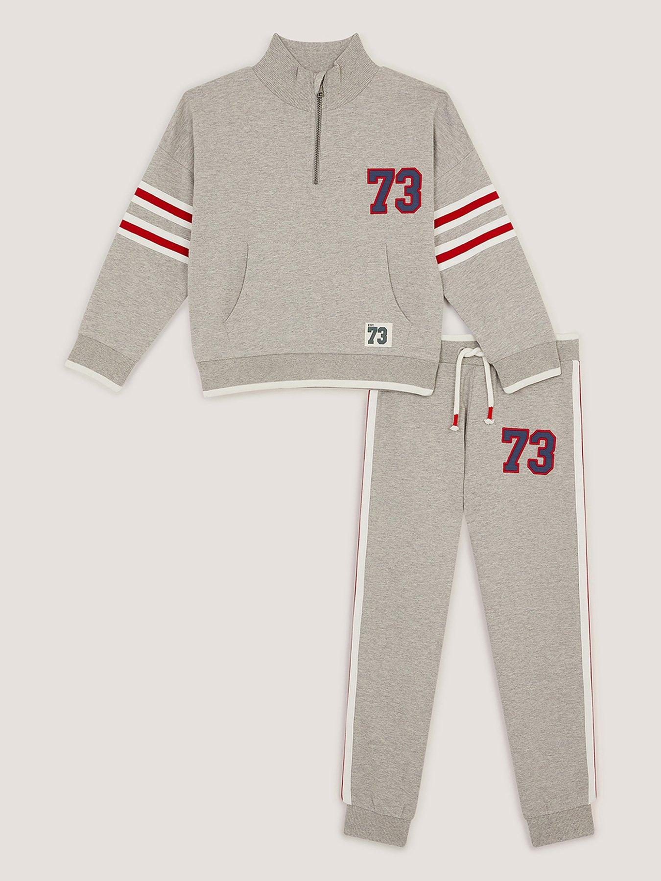 Monsoon Boys Half Zip 73 Sweat Set - GreyLazy day uniform. The perfect outfit for lounging at home or long travel days, it's made with style and comfort in mind. The set includes a half-zip sweatshirt and matching jogging bottoms, both finished with sporty stripes in red and white and '73' embroidered logos. Sold as a set.