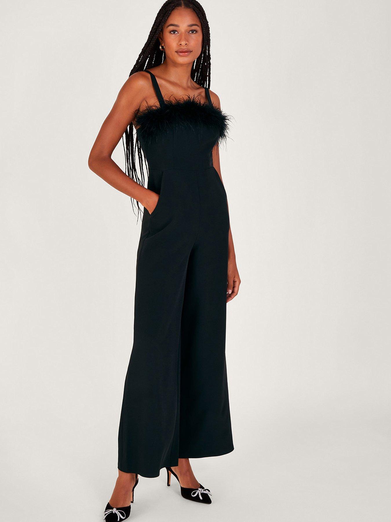 Monsoon Eva Feather JumpsuitShake ya' tail feathers. This jumpsuit is designed with our all-time favourite trend: feather trims. The bodice features sturdy shoulder straps, falling into long, wide legs for a glam finish. We. Are. Obsessed.