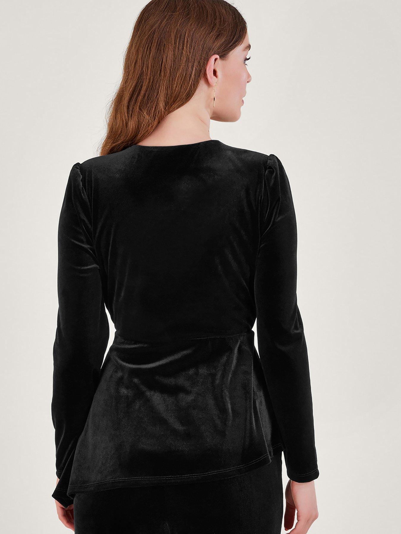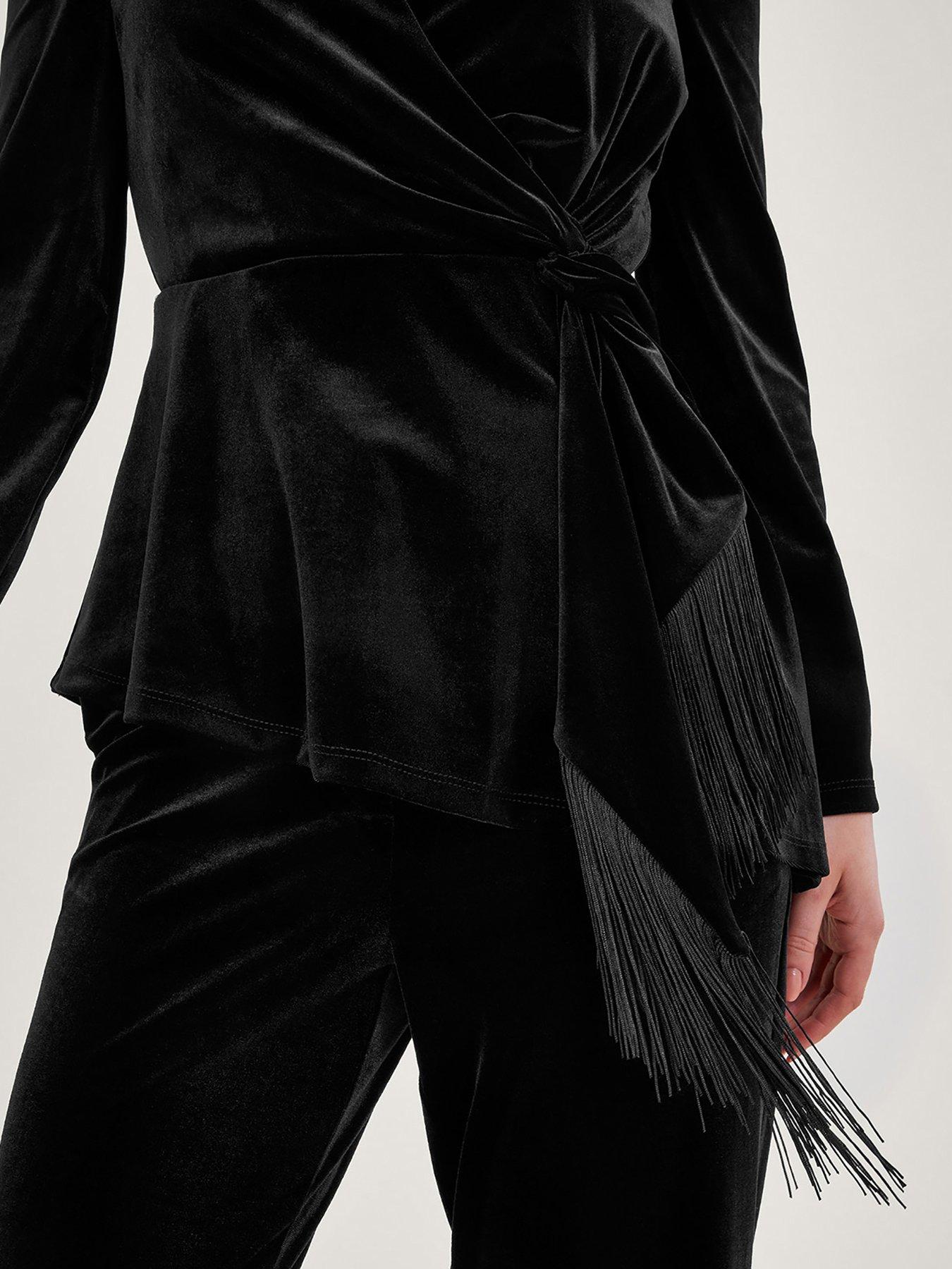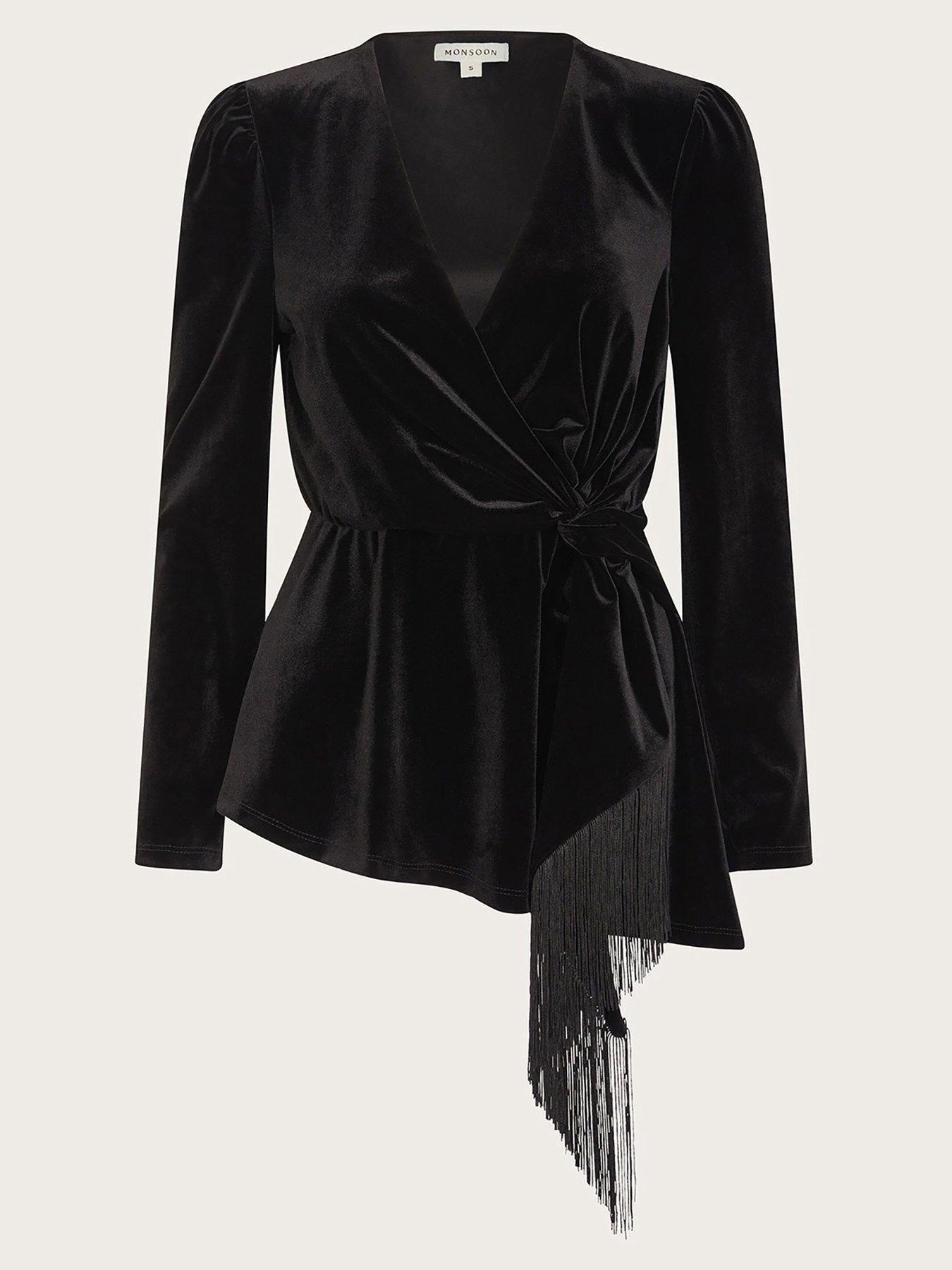 Monsoon Flossie Velvet Fringe TopPretend you're Parisian. This black velour wrap shirt is a must for party season. The pintuck shoulders and v-neckline create a sophisticated profile, while the tassel tie waist adds a touch of fun. Now, where's the red wine?