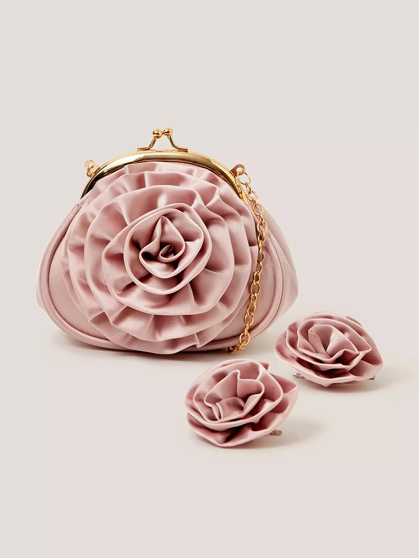 Be the bouquet! Your search for the perfect party accessories are over. Create a matching moment they'll love with this clip-frame bag and hair clip duo. Designed in dusty pink satin, they're decorated with ruffly roses. Sold as a set. Warning! Choking Hazard. Small parts. Not suitable for children under 3 years old.- Material Content: Composite: Iron 20%, Polyester 80%