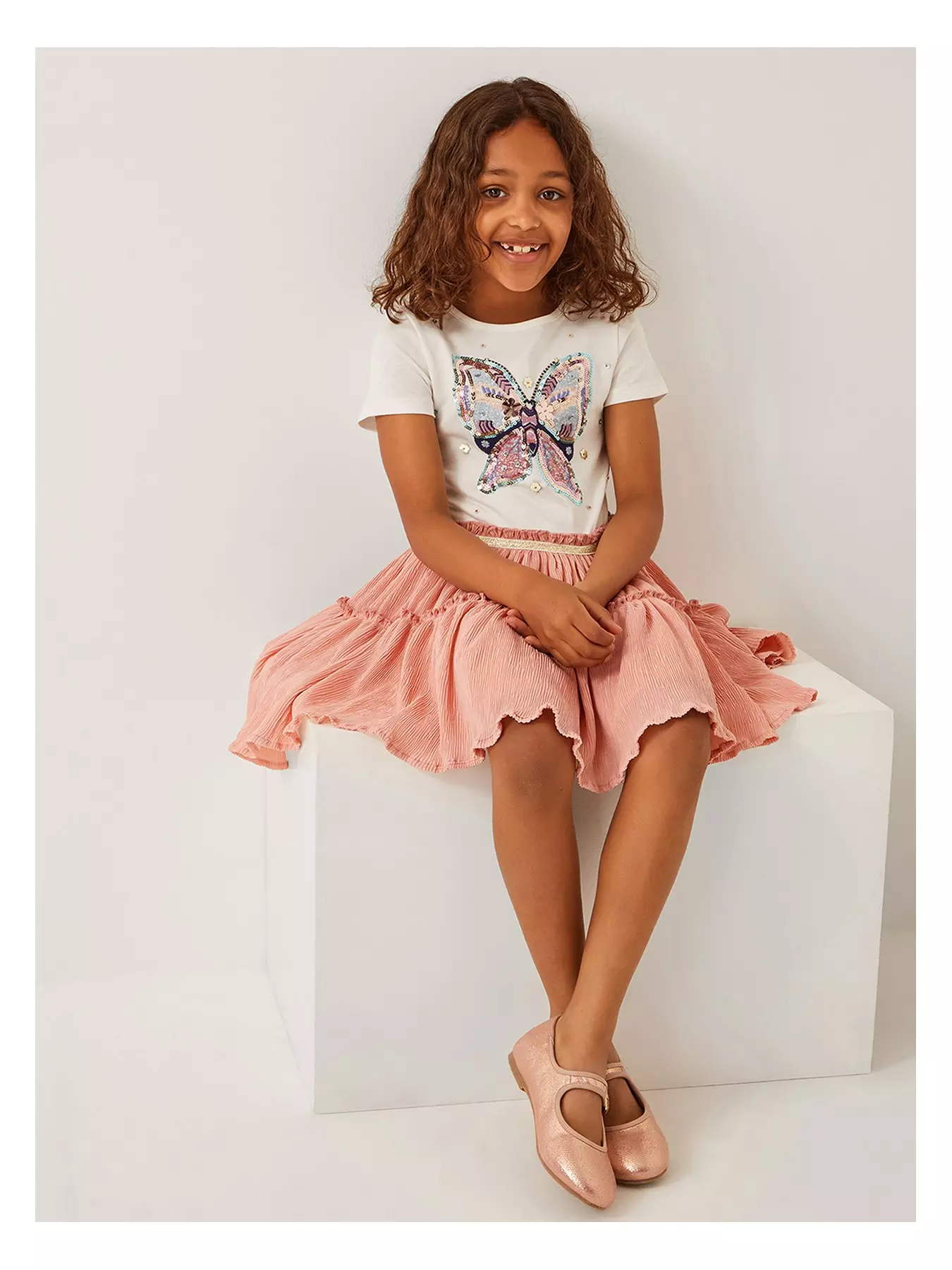 Flutterbies and sparkles! Designed with a T-shirt bodice and swishy textured skirt, this dress is ready to party. Decorated with a glitzy butterfly, shimmery sequins and shiny flower embellishments.- Material Content: Lining: Polyester 100%, Outer Skirt: Polyester () 100%, Inner Skirt: Polyester () 100%, Bodice: Cotton (b) 100%